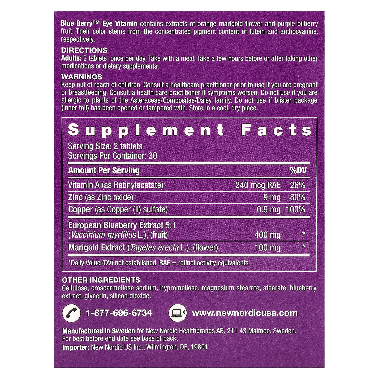 Blue Berry™ Eye Vitamin contains extracts of orange marigold flower and purple bilberry fruit. Their color stems from the concentrated pigment content of lutein and anthocyanins, respectively.