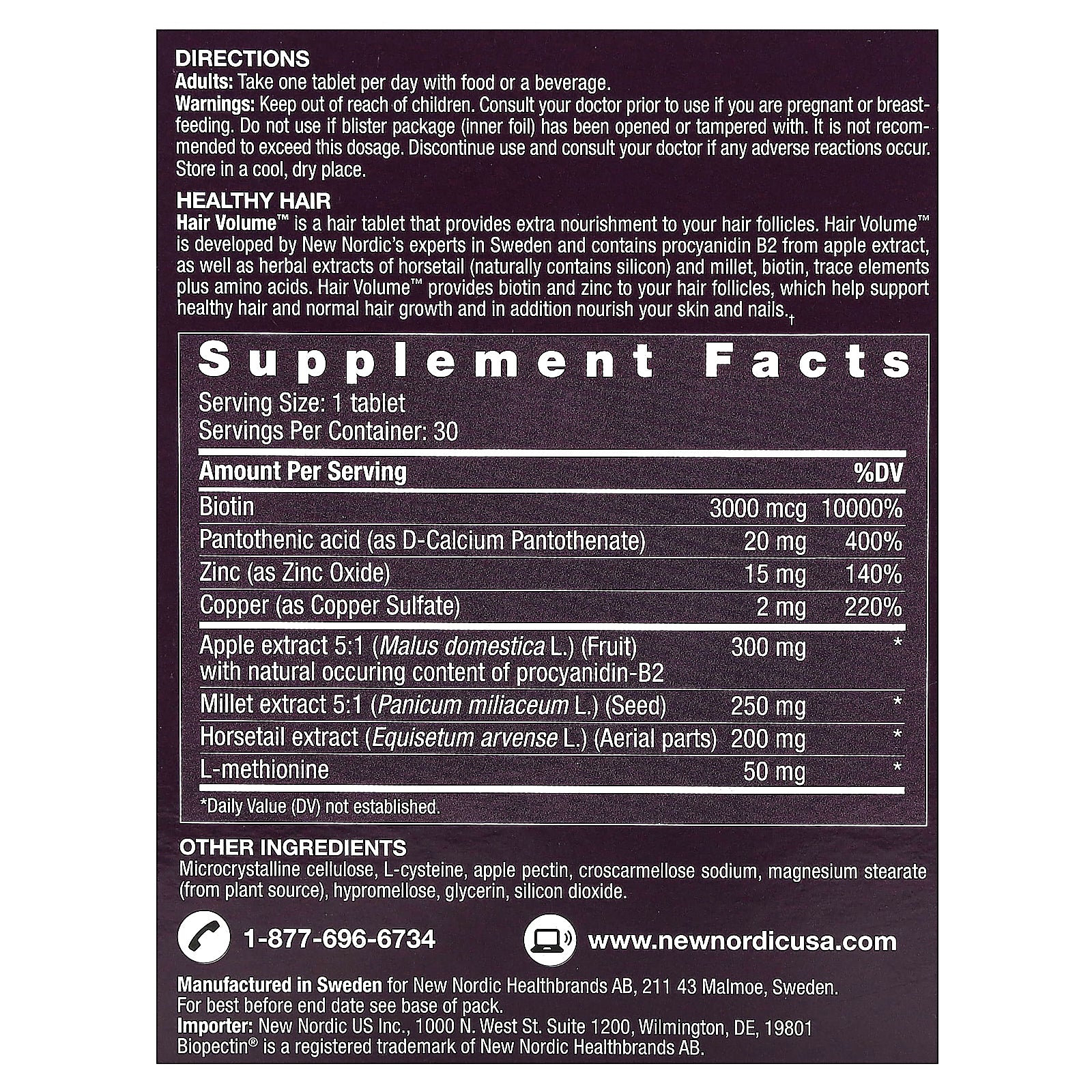 Hair Volume™ is a hair tablet that provides extra nourishment to your hair follicles. Hair Volume™ is developed by New Nordic's experts in Sweden and contains procyanidin B2 from apple extract, as well as herbal extracts of horsetail and millet, biotin, trace elements plus amino acids. Hair Volume™ provides biotin and zinc to your hair follicles, which help support healthy hair and normal hair growth and in addition nourish your skin and nails.