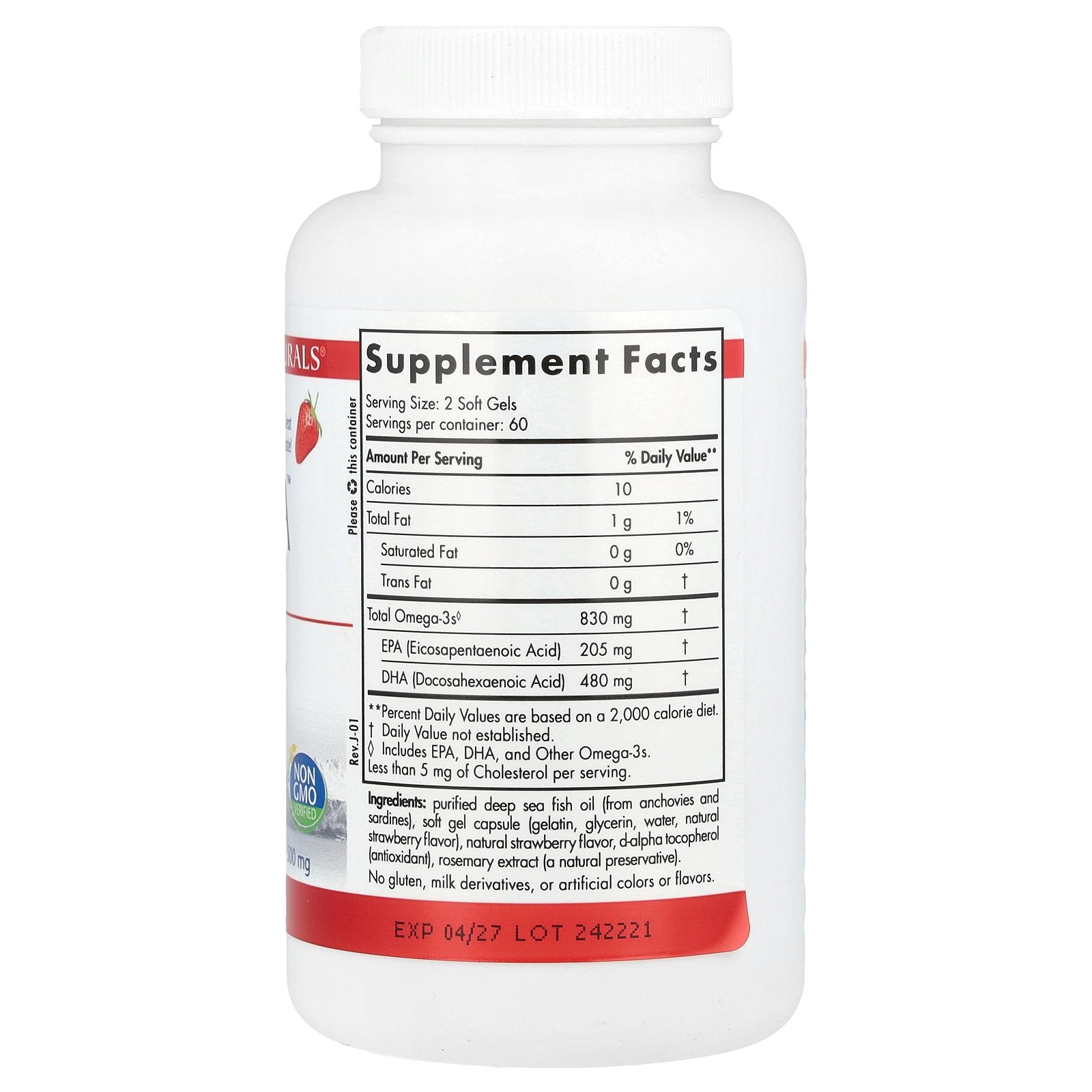 Purified deep sea fish oil (from anchovies and sardines), soft gel capsule (gelatin, glycerin, water, natural strawberry flavor), natural strawberry flavor, d-alpha tocopherol (antioxidant), rosemary extract (a natural preservative).