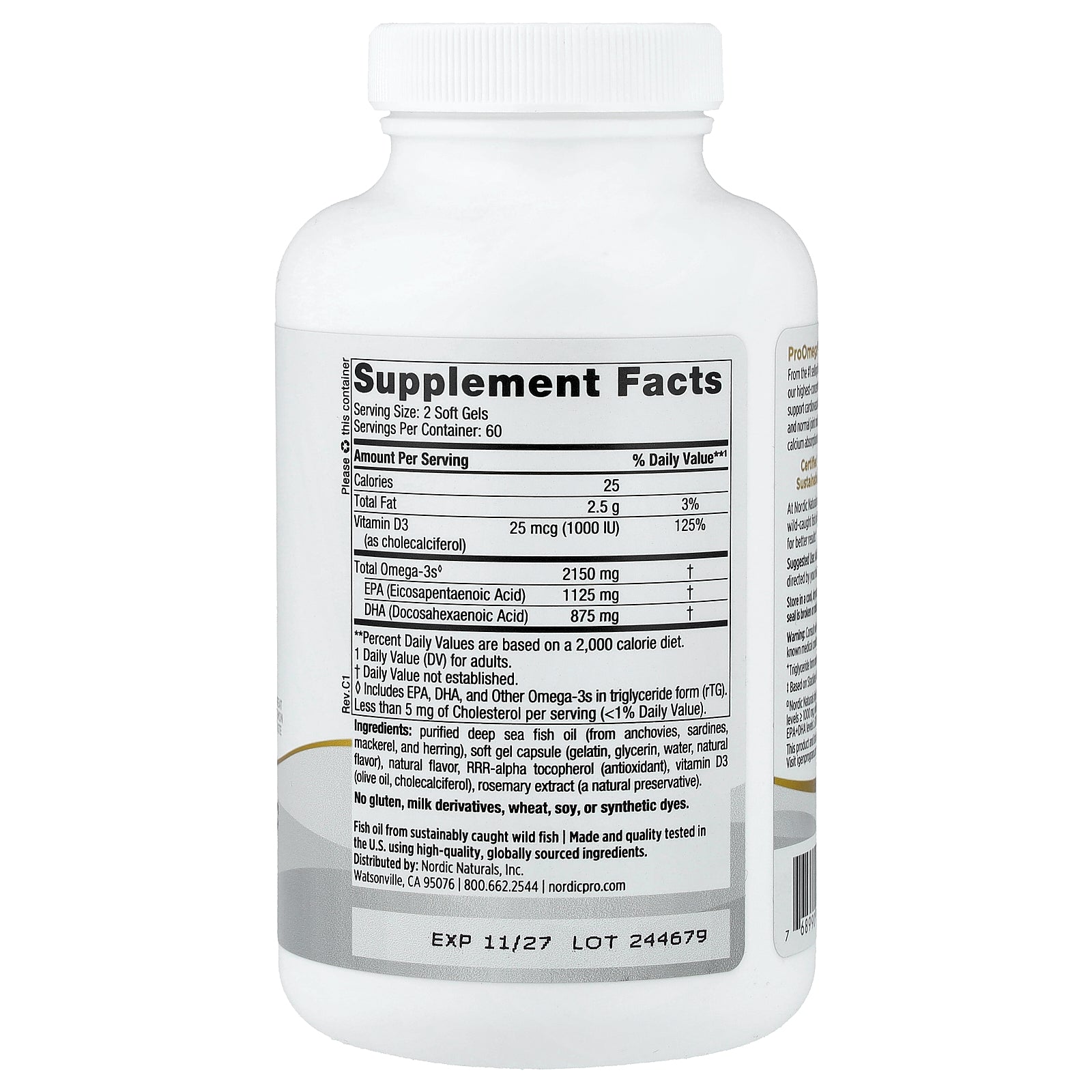 Purified deep sea fish oil (from anchovies, sardines, mackerel, and herring), soft gel capsule (gelatin, glycerin, water, natural flavor), natural flavor, RRR-alpha tocopherol (antioxidant), vitamin D3 (olive oil, cholecalciferol), rosemary extract (a natural preservative).