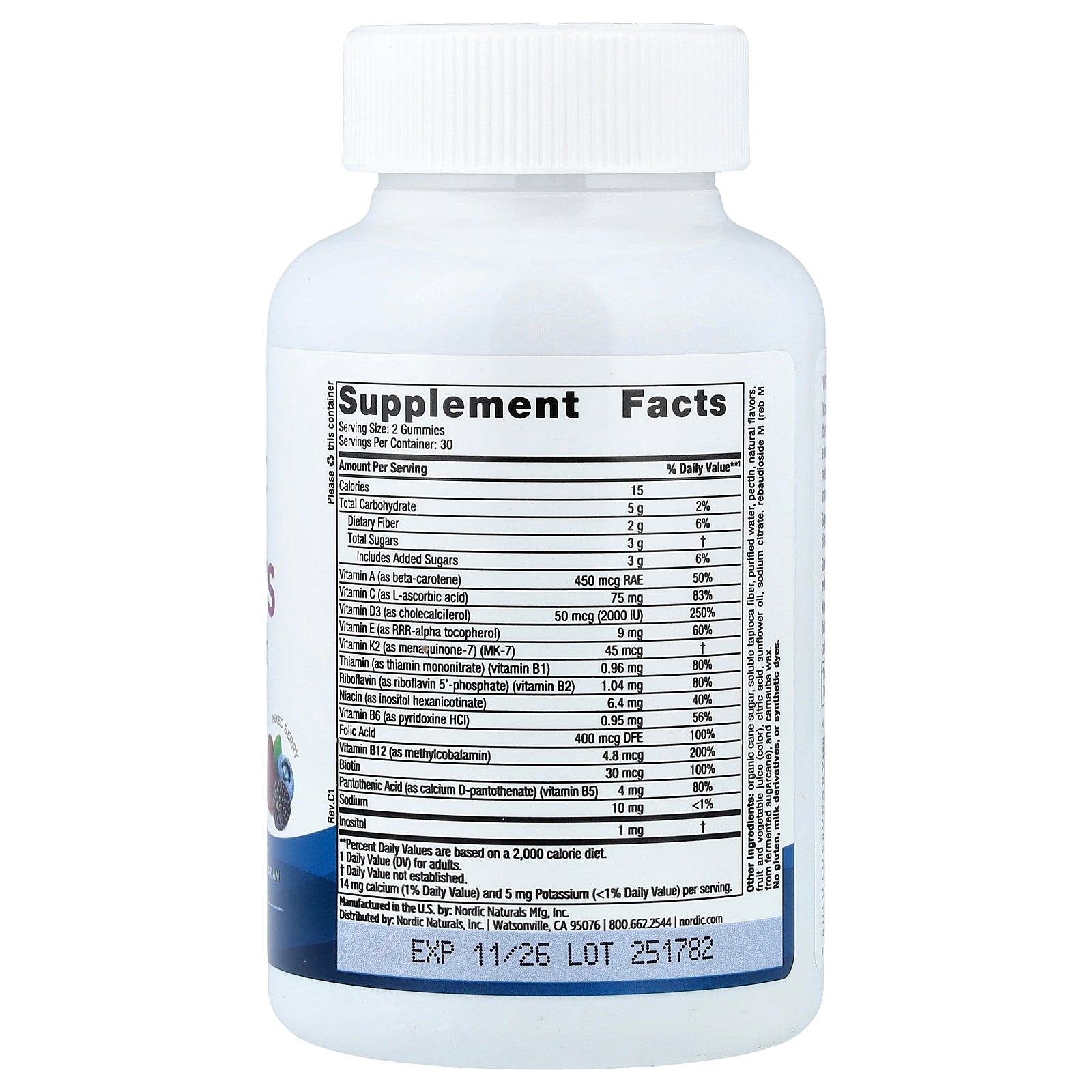 Organic cane sugar, soluble tapioca fiber, purified water, pectin, natural flavors, fruit and vegetable juice (color), citric acid, sunflower oil, sodium citrate, rebaudioside M (reb M from fermented sugarcane), and carnauba wax.