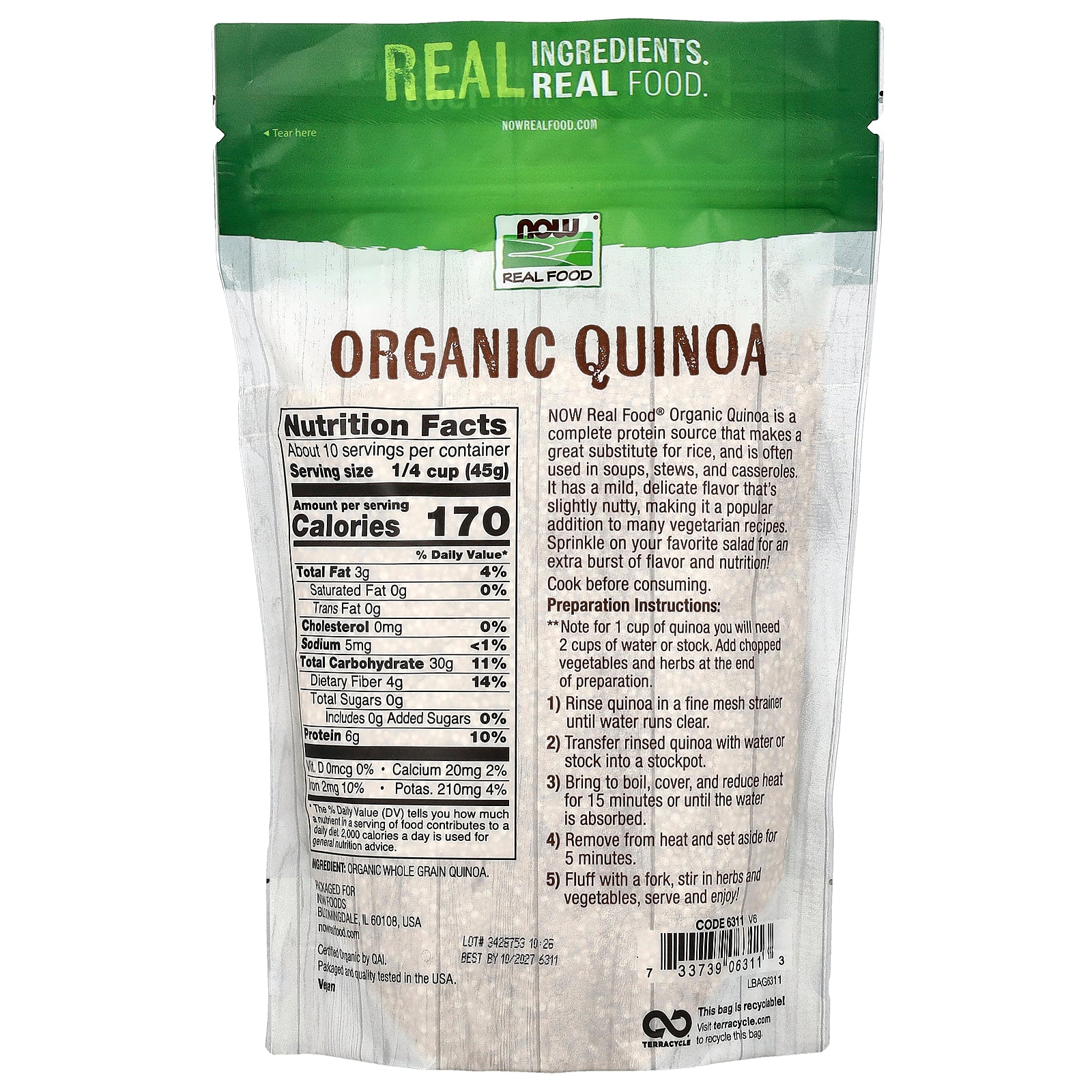 NOW Real Food® Organic Quinoa is a complete protein source that makes a great substitute for rice, and is often used in soups, stews, and casseroles. It has a mild, delicate flavor that's slightly nutty, making it a popular addition to many vegetarian recipes. Sprinkle on your favorite salad for an extra burst of flavor and nutrition!