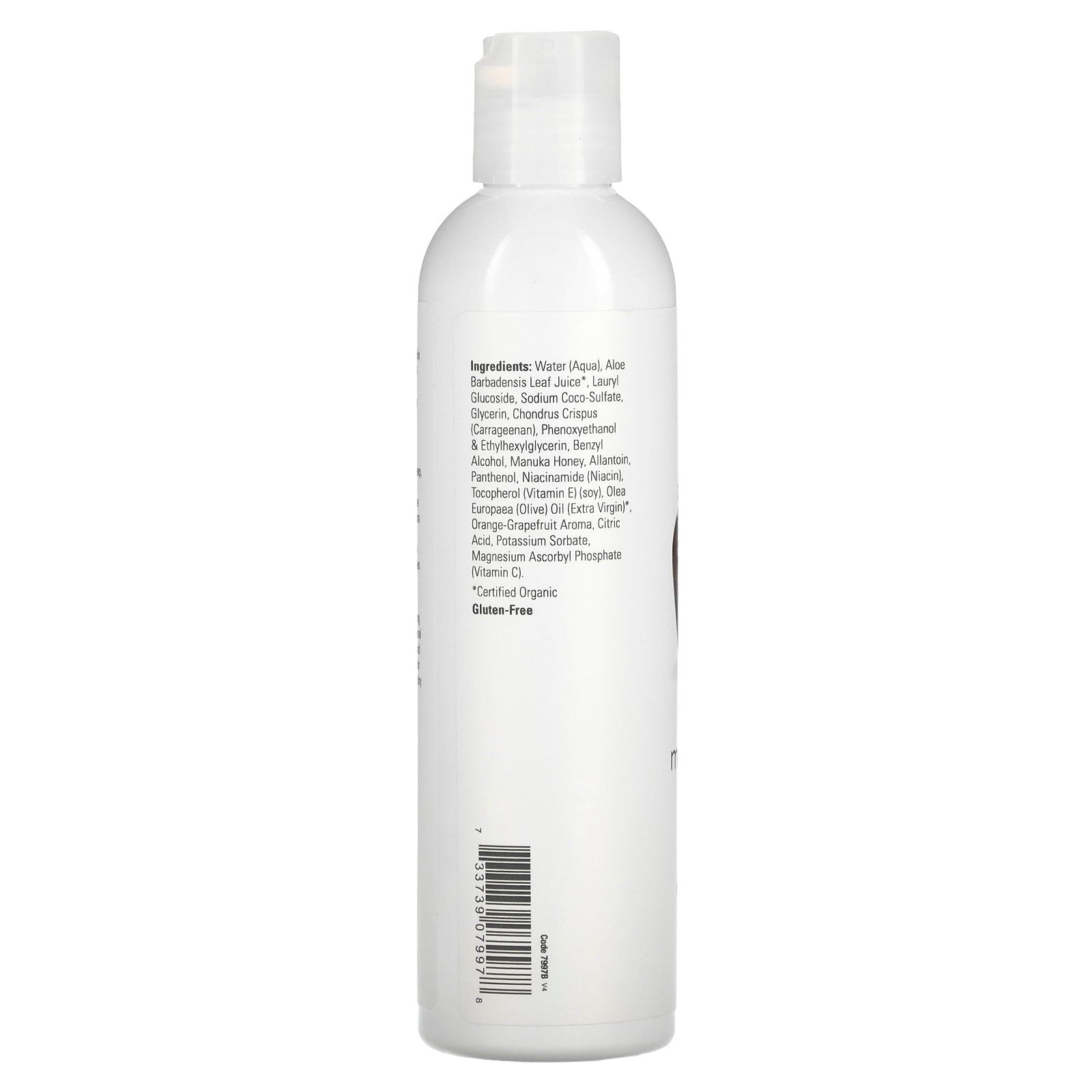 Water (aqua), aloe barbadensis leaf juice*, lauryl glucoside, sodium coco-sulfate, glycerin, chondrus crispus (carrageenan), phenoxyethanol & ethylhexylglycerin, benzyl alcohol, manuka honey, allantoin, panthenol, niacinamide (niacin), tocopherol (vitamin E) (soy), olea europaea (olive) oil (extra virgin), orange-grapefruit aroma, citric acid, potassium sorbate, magnesium ascorbyl phosphate (vitamin C).