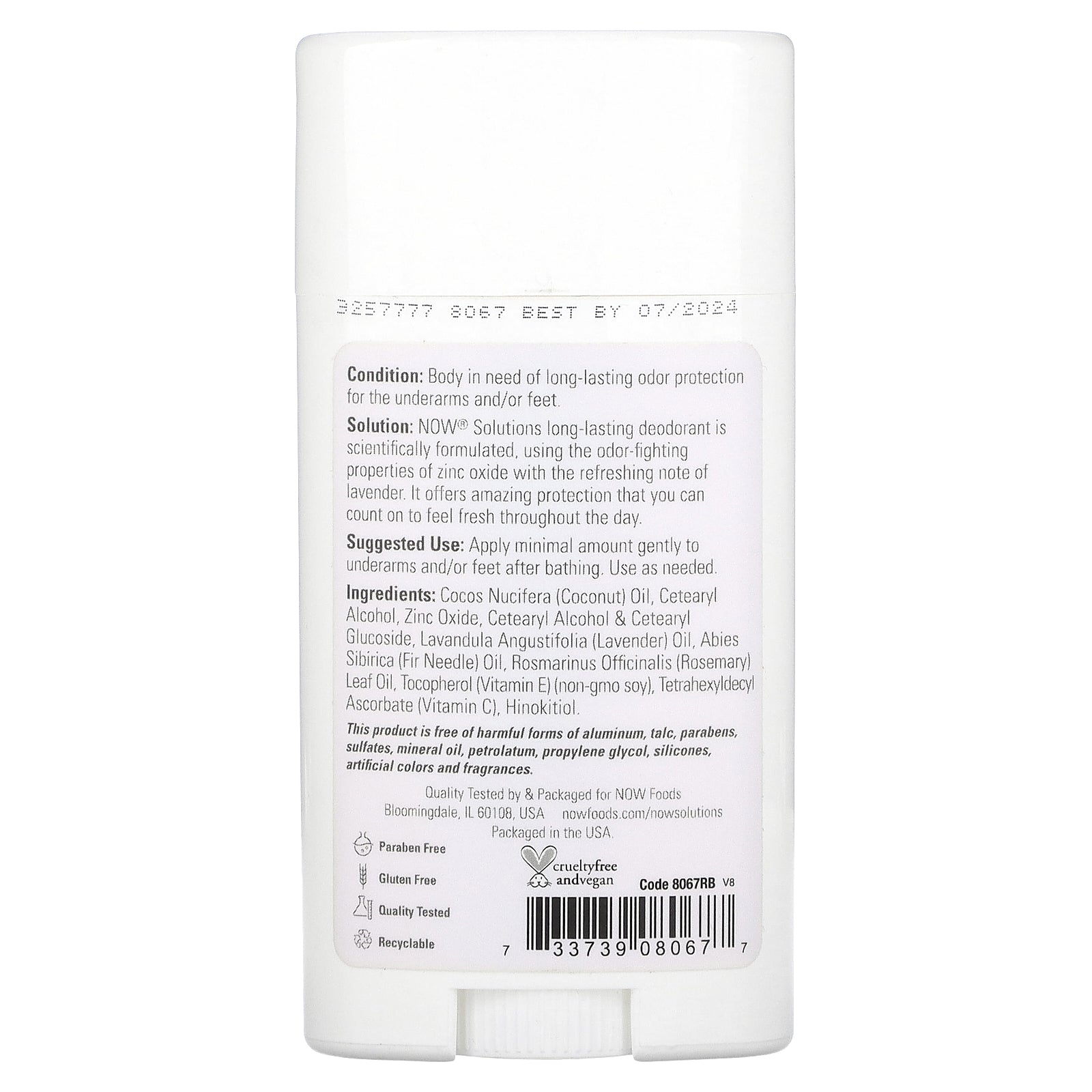 Solution: NOW® Solutions long-lasting deodorant is scientifically formulated, using the odor-fighting properties of zinc oxide with the refreshing note of lavender. It offers amazing protection that you can count on to feel fresh throughout the day.