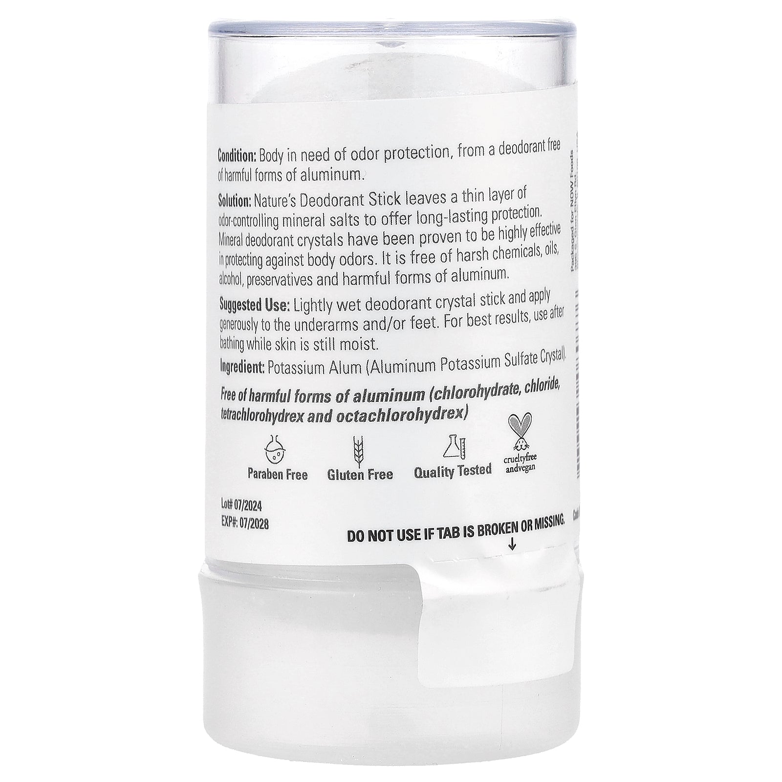Solution: Nature's Deodorant Stick leaves a thin layer of odor-controlling mineral salts to offer long-lasting, natural protection. Natural deodorant crystals have been proven to be highly effective in protecting against body odors. It is free of harsh chemicals, oils, alcohol, preservatives and harmful forms of aluminum.