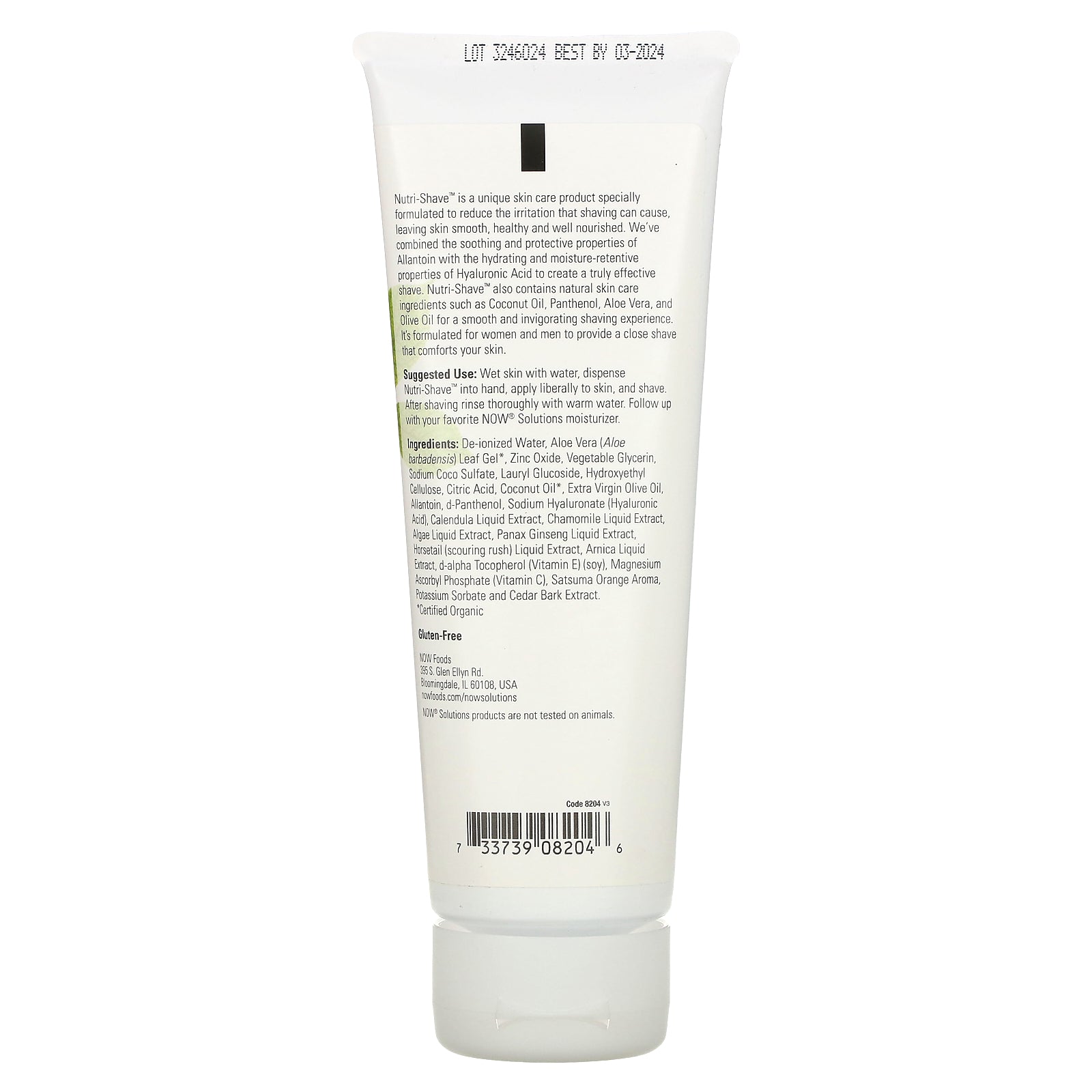 Wet skin with water, dispense Nutri-Shave™ into hand, apply liberally to skin, and shave. After shaving rinse thoroughly with warm water. Follow up with your favorite NOW® Solutions moisturizer.
