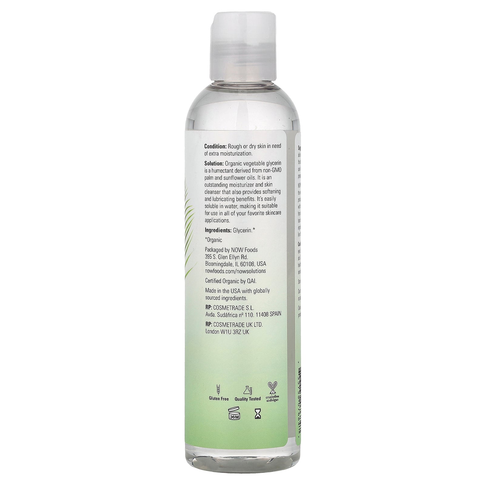 For soft, luxurious skin simply massage a few drops of pure organic vegetable glycerine on the desired area as needed. Ideal for use in a variety of DIY cosmetic preparations to help boost moisture.