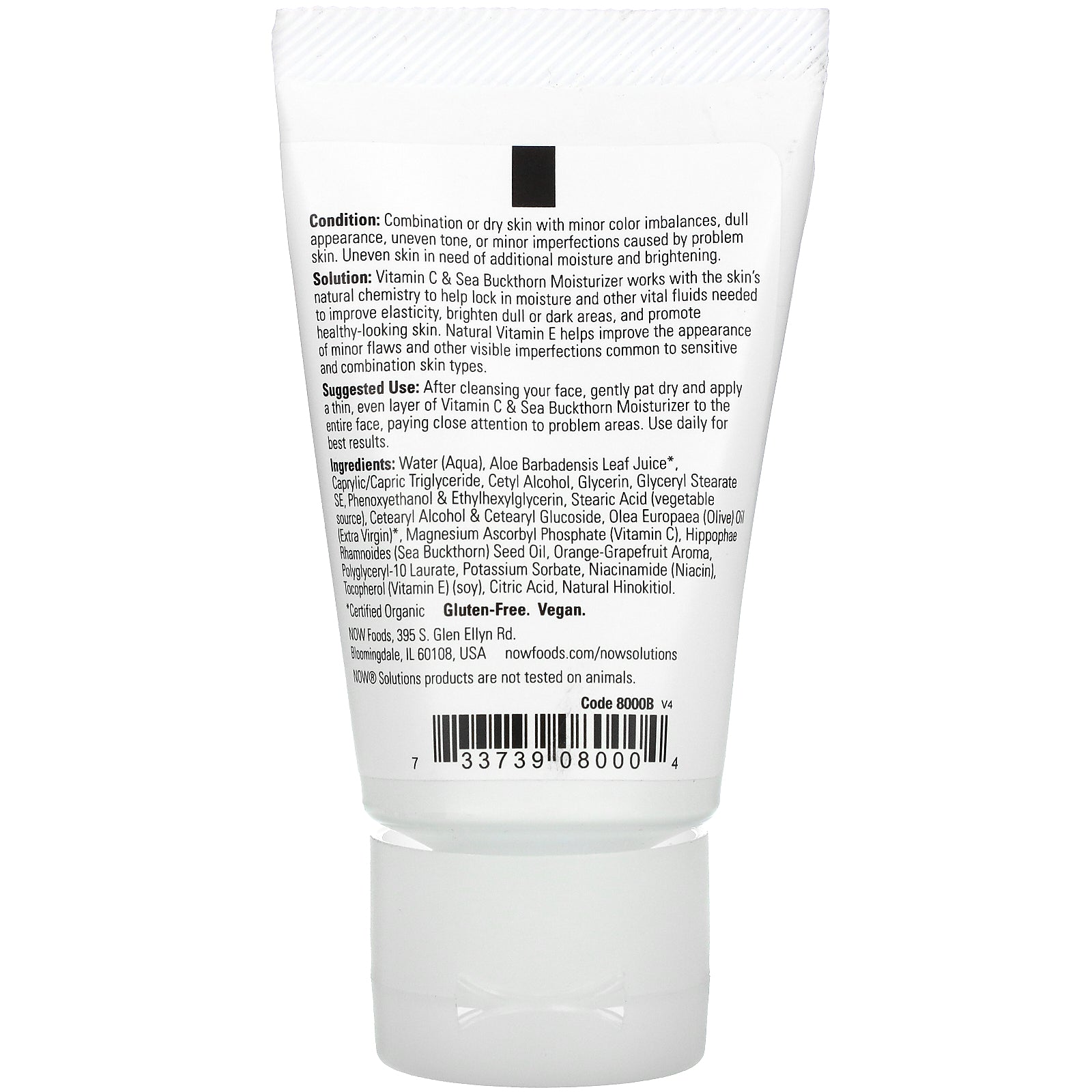 Solution: Vitamin C & Sea Buckthorn Moisturizer works with the skin's natural chemistry to help lock in moisture and other vital fluids needed to improve elasticity, brighten dull or dark areas, and promote healthy-looking skin. Natural Vitamin E helps improve the appearance of minor flaws and other visible imperfections common to sensitive and combination skin types.