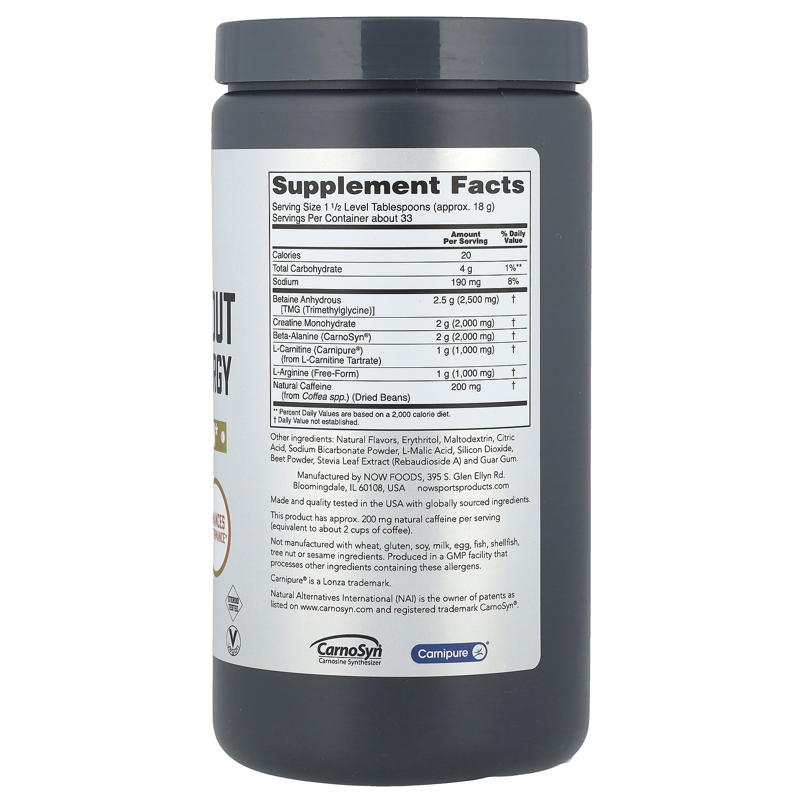 NOW® Sports Pre-Workout Advanced Energy Powder features betaine, creatine, beta-alanine, carnitine, arginine, and caffeine to help you stay focused and energized so you can train harder and longer. This formula has betaine to help promote endurance and optimize muscle output during exercise, and beta-alanine to delay muscle fatigue and promote rapid recovery from intense exercise. Arginine is included to support nitric oxide production and nutrient delivery. With 200 mg caffeine per serving, this great-tasting supplement helps you maintain physical energy and focus during your workout.
