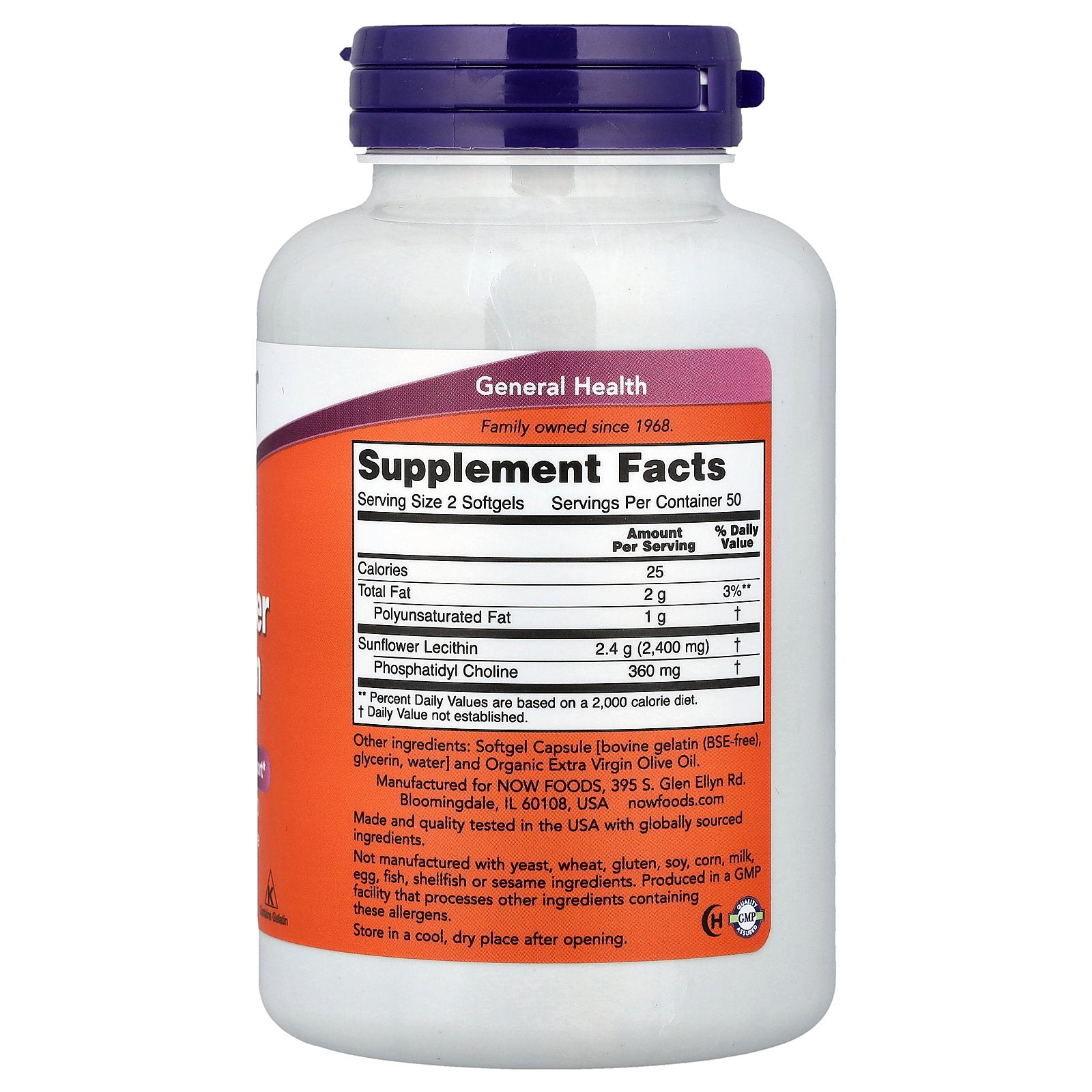 NOW® Sunflower Lecithin has phosphatidyl choline, the most abundant phospholipid in the cell membrane, where it plays a key role in cellular signaling and synaptic function. NOW® Sunflower Lecithin also naturally abounds in phosphatidyl inositol, phosphatidyl ethanolamine, and essential fatty acids. Lecithin in the diet aids in emulsifying fats, enabling them to be dispersed in water; and as a choline-containing phospholipid, its choline is easily absorbed and utilized by the body. NOW® Sunflower Lecithin Softgels are non-GMO and soy-free.