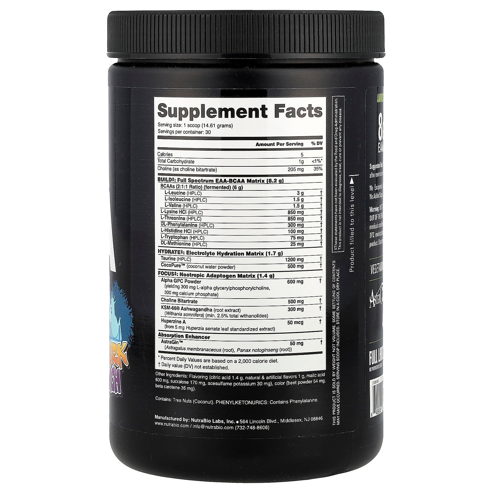 Build: Full Spectrum EAA-BCAA Matrix (8.2 g) BCAAs (2:1:1 Ratio) (fermented) (6 g) L-Leucine (HPLC) L-Isoleucine (HPLC) L-Valine (HPLC) L-Lysine HCl (HPLC) L-Threonine (HPLC) DL-Phenylalanine (HPLC) L-Histidine HCl (HPLC) L-Tryptophan (HPLC) DL-Methionine (HPLC) |