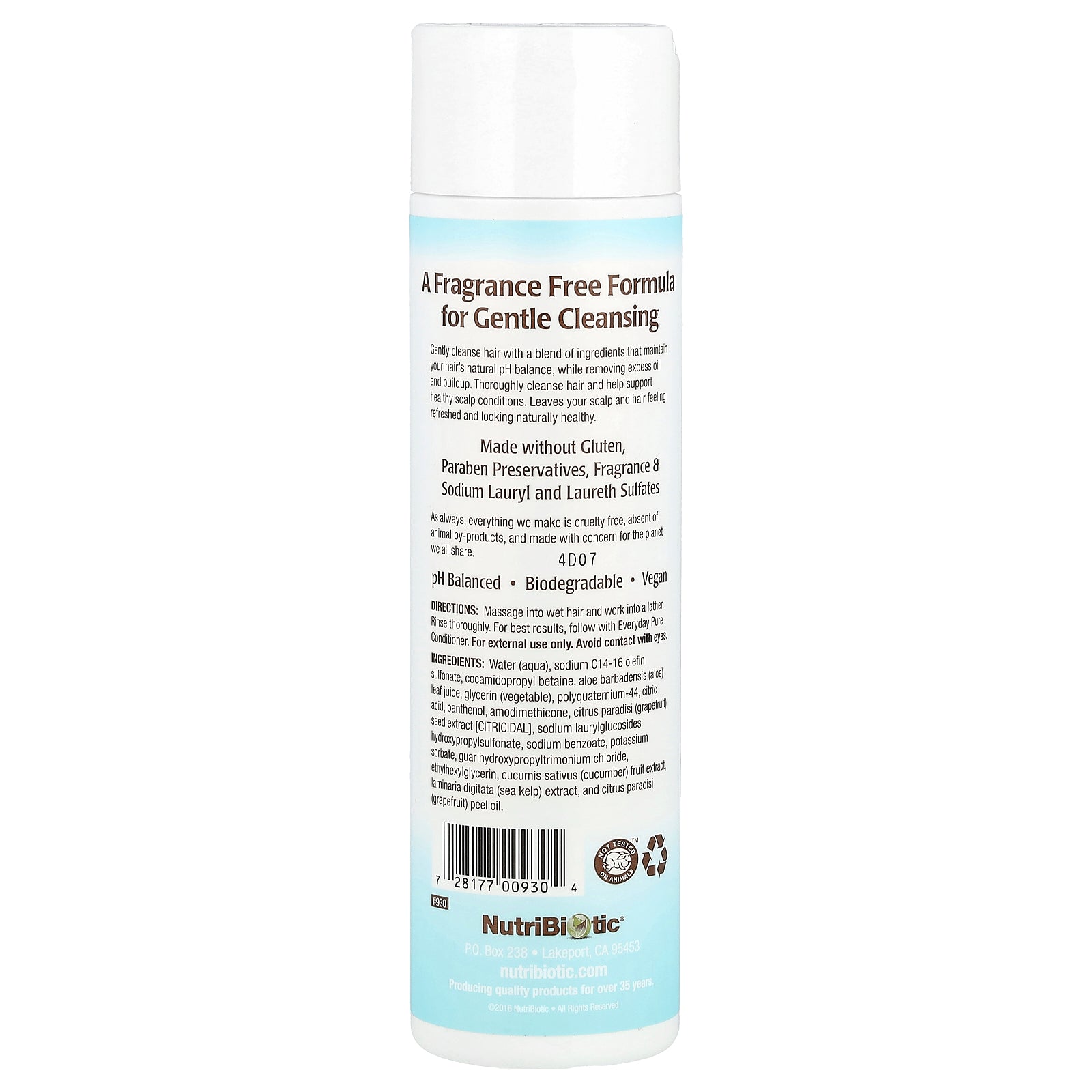 Water (aqua), sodium c14-16 olefin sulfonate, cocamidopropyl betaine, aloe barbadensis (aloe) leaf juice, glycerin (vegetable), polyquaternium-44, citric acid, panthenol, amodimethicone, citrus paradisi (grapefruit) seed extract [citricidal], sodium laurylglucosides hydroxypropylsulfonate, sodium benzoate, potassium sorbate, guar hydroxypropyltrimonium chloride, ethylhexylglycerin, cucumis sativus (cucumber) fruit extract, laminaria digitata (sea kelp) extract, and citrus paradisi (grapefruit) peel oil.