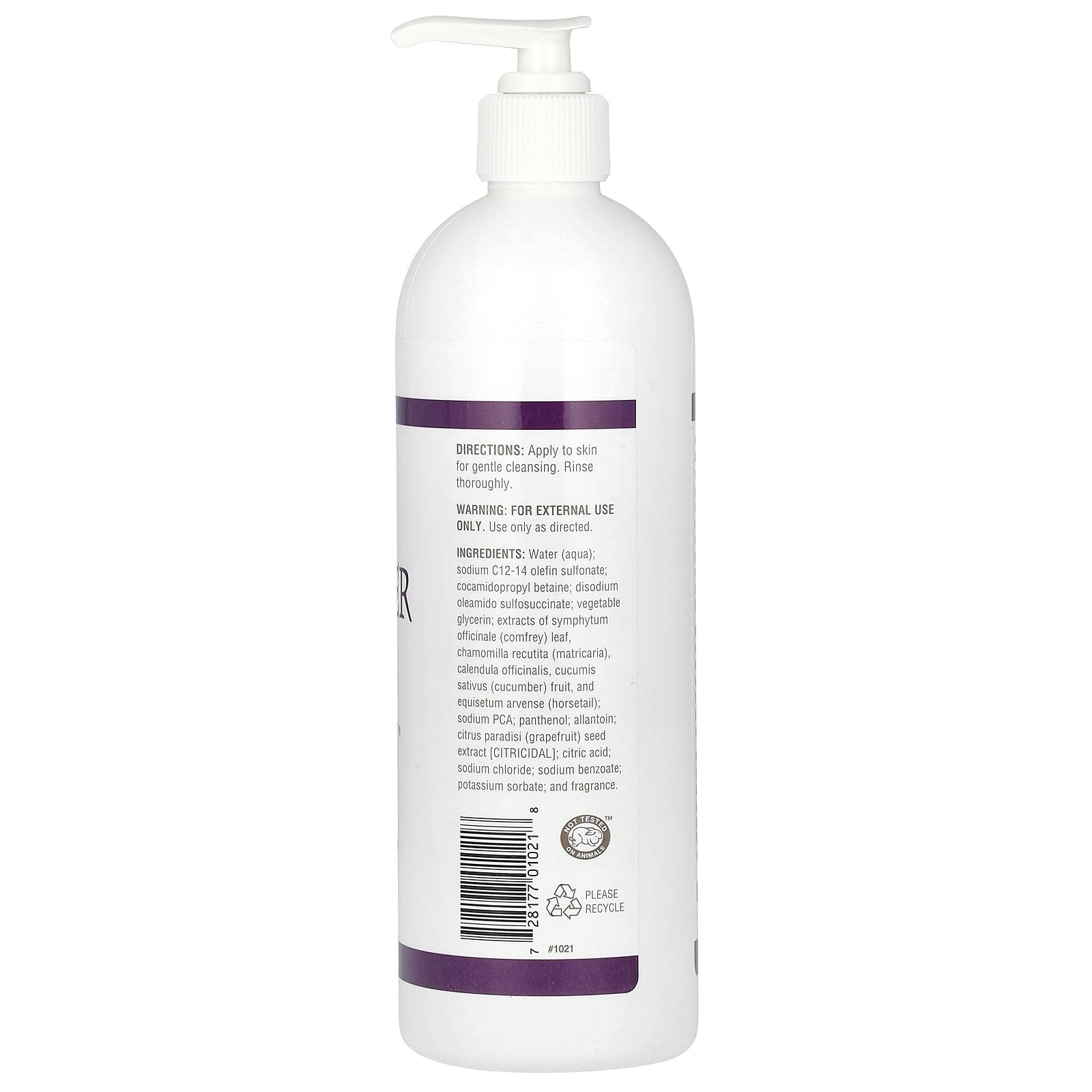 Water (aqua); sodium C14-16 olefin sulfonate; cocamidopropyl betaine, disodium oleamido sulfosuccinate, vegetable glycerin, extracts of symphytum officinale (comfrey) leaf, chamomilla recutita (matricaria), calendula officinalis, cucumis sativus (cucumber) fruit, and equisetum arvense (horsetail); sodium PCA; panthenol; allantoin; citrus paradisi (grapefruit) seed extract [citricidal]; citric acid; sodium chloride, sodium benzoate, potassium sorbate, and fragrance.