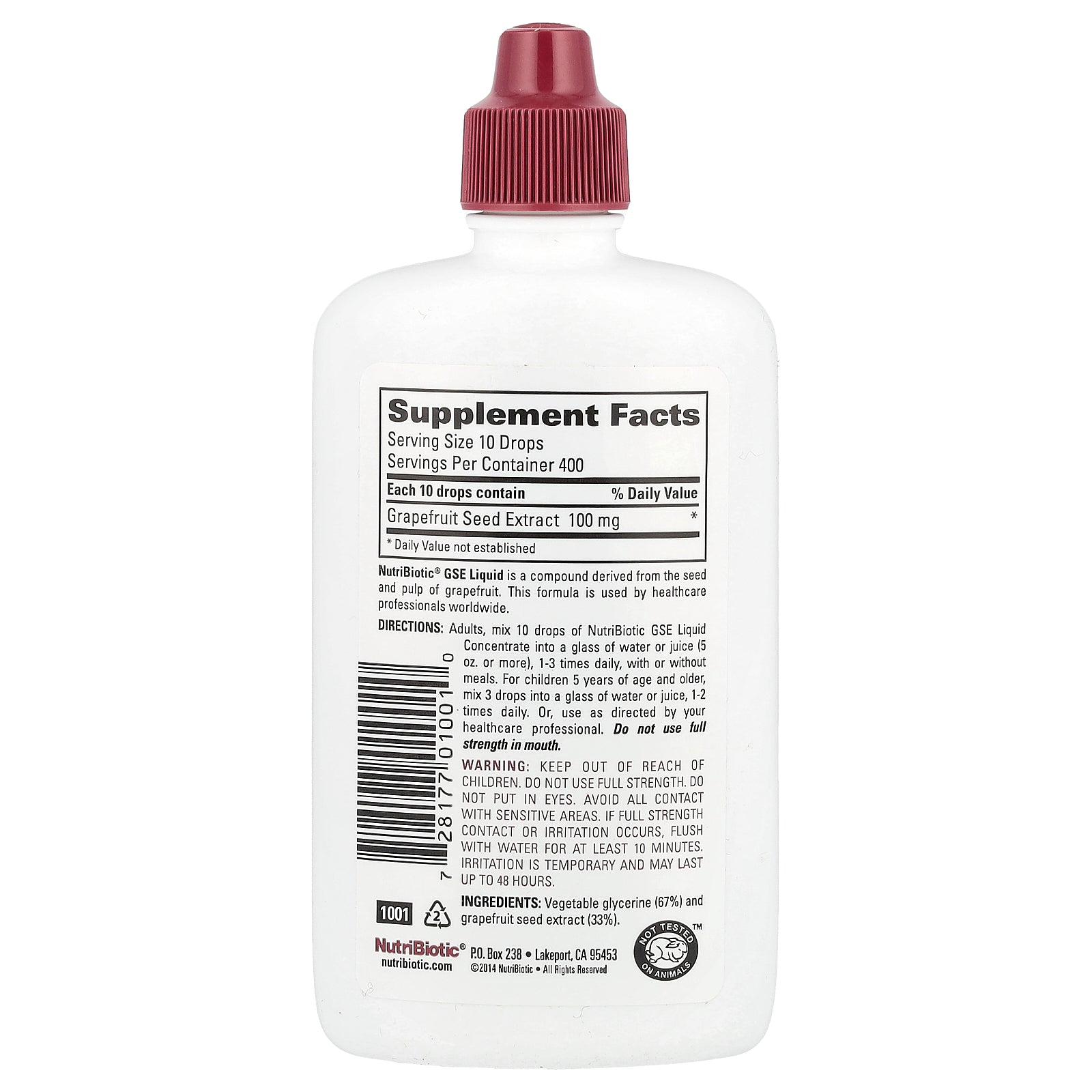 Adults, mix 10 drops of NutriBiotic GSE Liquid Concentrate into a glass of water or juice (5 oz or more), 1-3 times daily, with or without meals.