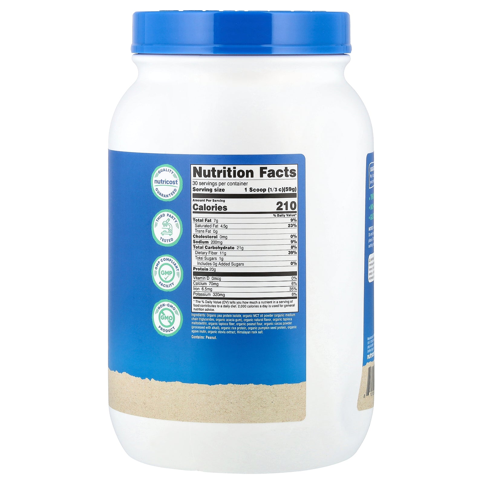 Organic pea protein isolate, organic MCT oil powder (organic medium chain triglycerides, organic acacia gum), organic natural flavor, organic tapioca maltodextrin, organic tapioca fiber, organic peanut flour, organic cocoa powder (processed with alkali), organic rice protein, organic pumpkin seed protein, organic agave inulin, organic stevia extract, Himalayan rock salt.