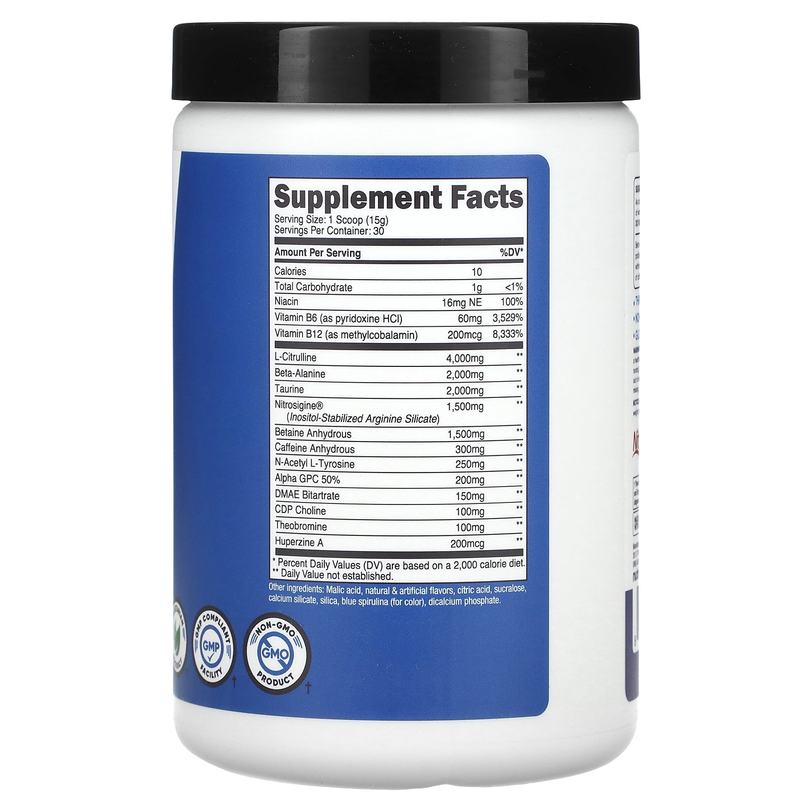 15 grams of high quality pre-workout formula in every serving. Nutricost pre-workout powder contains l-citrulline, beta alanine, taurine, Nitrosigine, caffeine anhydrous, theobromine, huperzine a, niacin, vitamin B6, and vitamin B12.