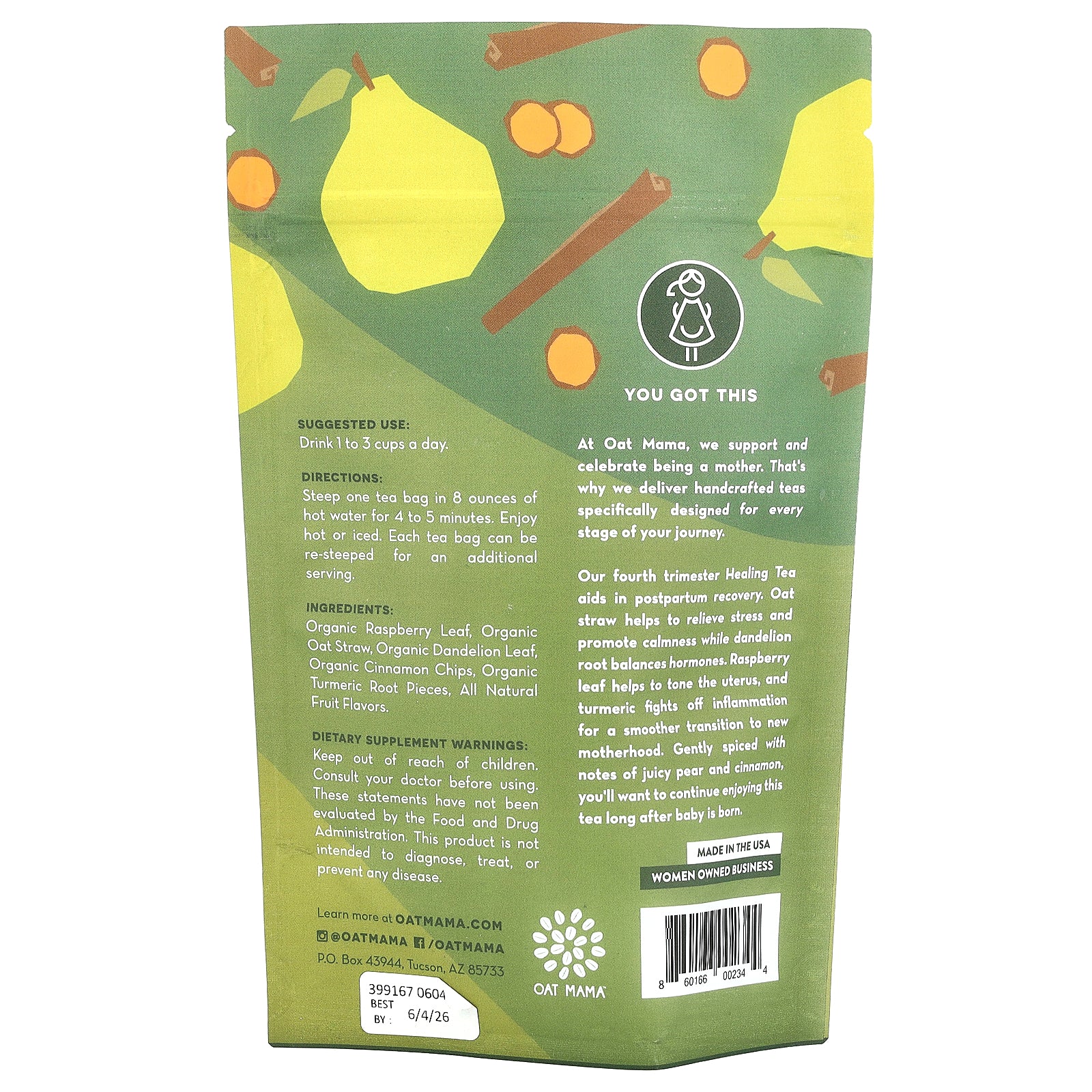 Our fourth trimester Healing Tea aids in postpartum recovery. Oat straw helps to relieve stress and promote calmness while dandelion root balances hormones. Raspberry leaf helps to tone the uterus, and turmeric fights off inflammation for a smoother transition to new motherhood. Gently spiced with notes of juicy pear and cinnamon, you'll want to continue enjoying this tea long after baby is born.
