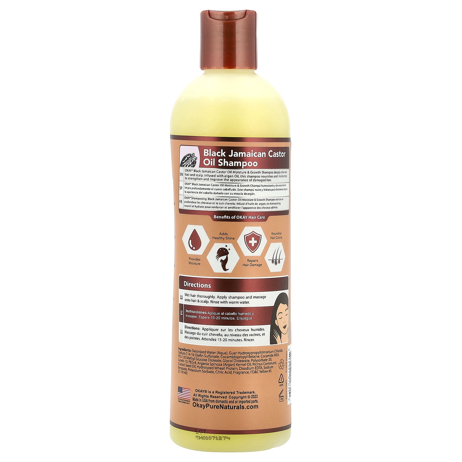 OKAY® Black Jamaican Castor Oil Moisture & Growth Shampoo deeply cleanses hair and scalp. Infused with argan Oil, this shampoo nourishes and moisturizes to strengthen and improve the appearance of damaged hair.
