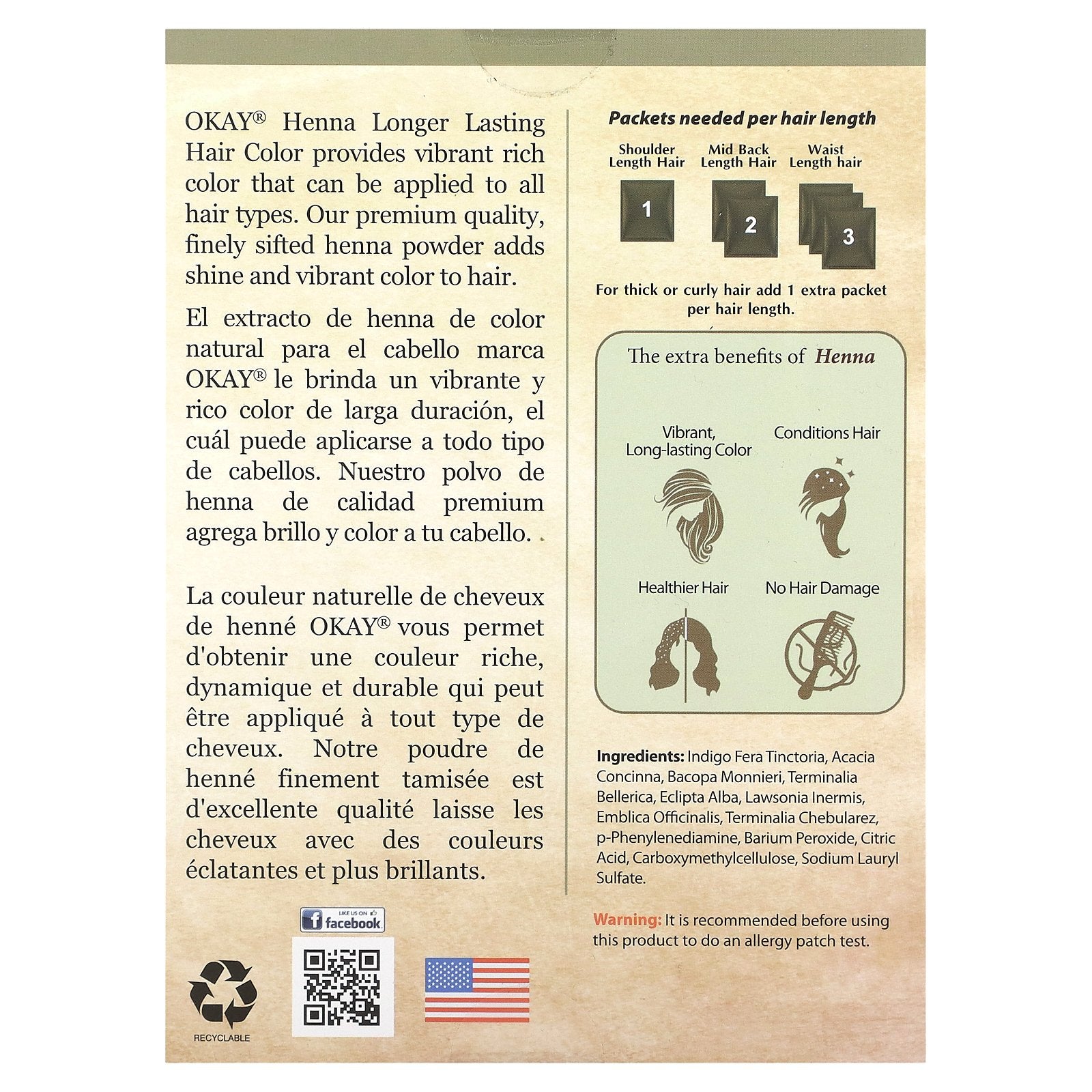 OKAY® Henna Longer Lasting Hair Color provides vibrant rich color that can be applied to all hair types. Our premium quality, finely sifted henna powder adds shine and vibrant color to hair.