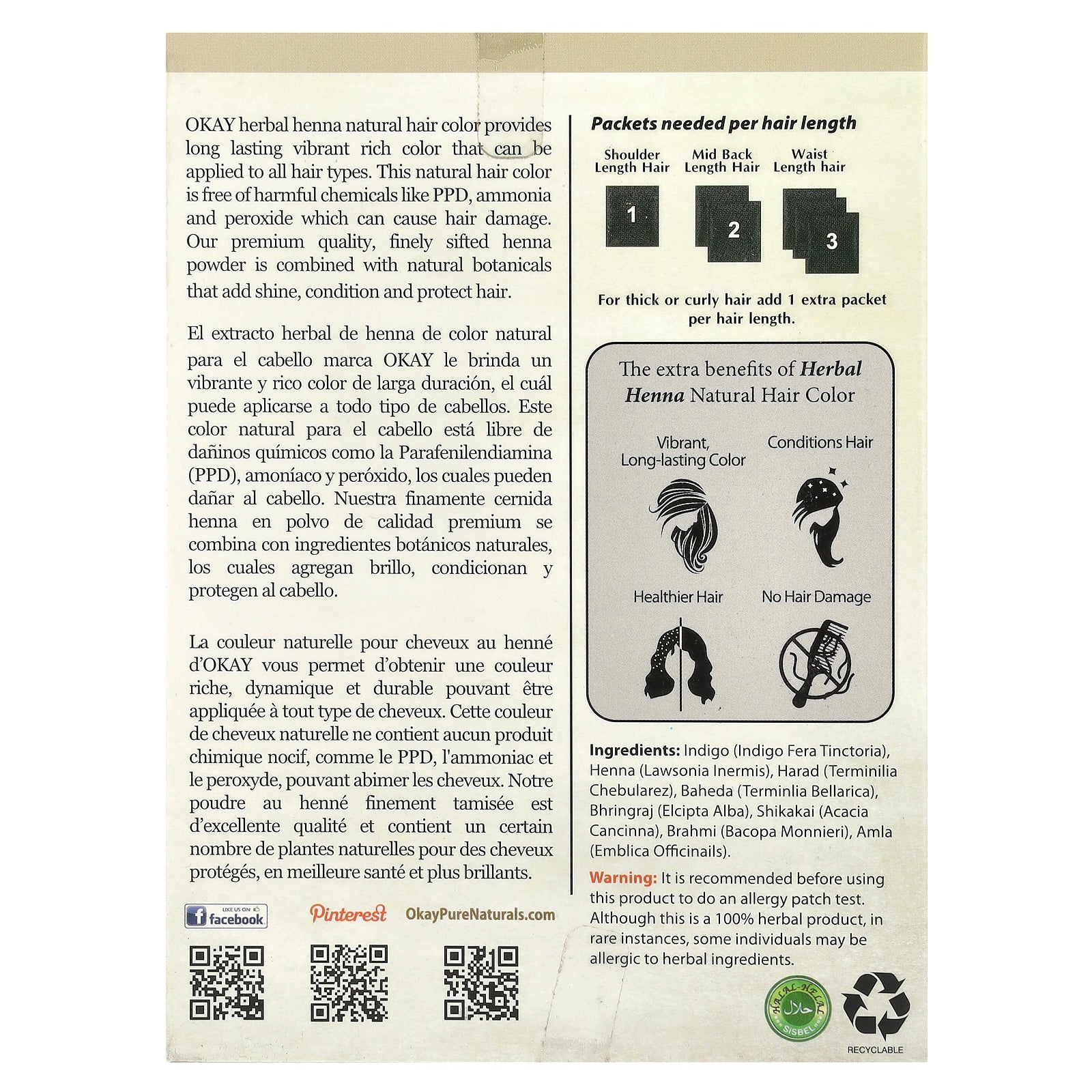 Okay herbal natural hair color provides long lasting vibrant, rich color that can be applied to all hair types. This natural hair color is free of harmful chemicals like PPD, ammonia and peroxide which can cause hair damage. Our premium quality, finely sifted henna powder is combined with natural botanicals that add shine, condition and protect hair.