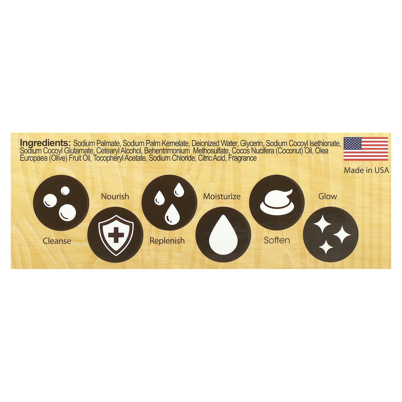 Sodium palmate, sodium palm kernelate, deionized water, glycerin, sodium cocoyl isethionate, sodium cocoyl glutamate, cetearyl alcohol, behentrimonium methosulfate, cocos nucifera (coconut) oil, olea europaea (olive) fruit oil, tocopheryl acetate, sodium chloride, citric acid, fragrance.