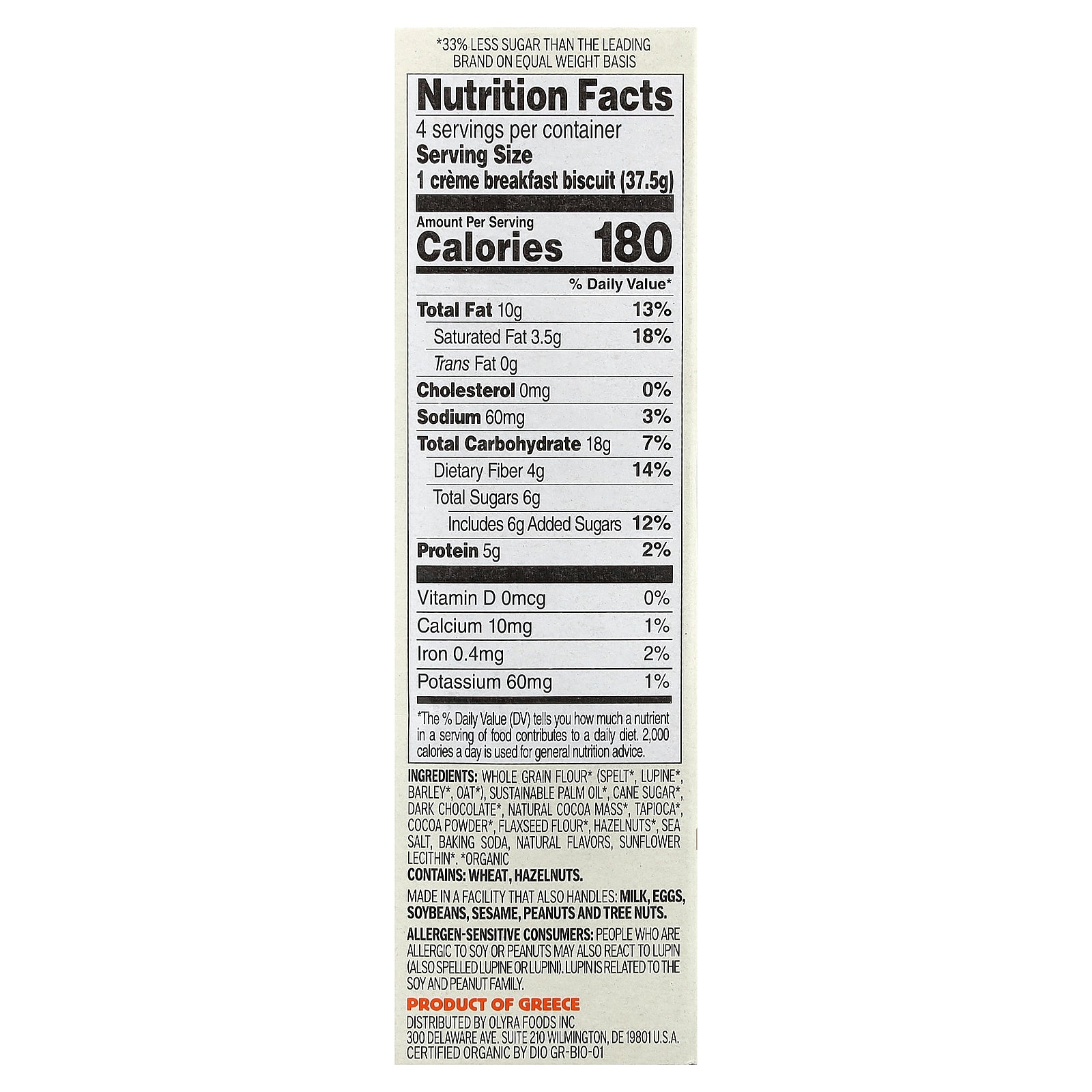 Whole grain flour* (spelt*, lupine*, barley*, oat*), sustainable palm oil*, cane sugar*, dark chocolate*, natural cocoa mass*, tapioca*, cocoa powder*, flaxseed flour*, hazelnuts*, sea salt, baking soda, natural flavors, sunflower lecithin*.