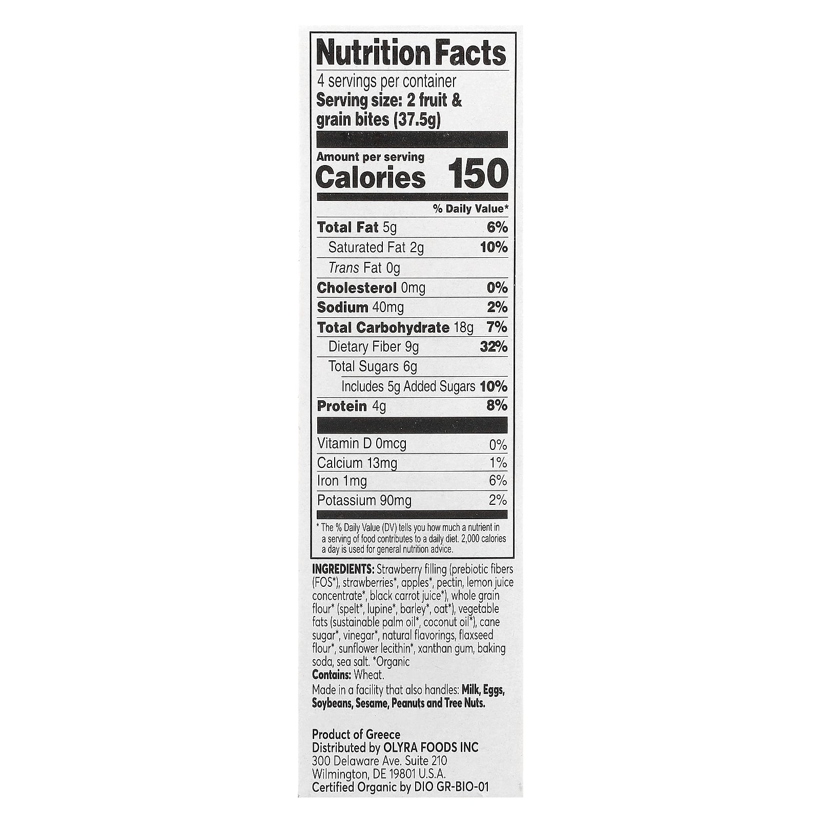 Strawberry filling (prebiotic fibers (FOS*), strawberries *, apples *, pectin, lemon juice concentrate *, black carrot juice*), whole grain flour* (spelt *, lupine *, barley *, oat*), vegetable fats (sustainable palm oil *, coconut oil*), cane sugar *, vinegar *, natural flavorings, flaxseed flour *, sunflower lecithin *, xanthan gum, baking soda, sea salt.