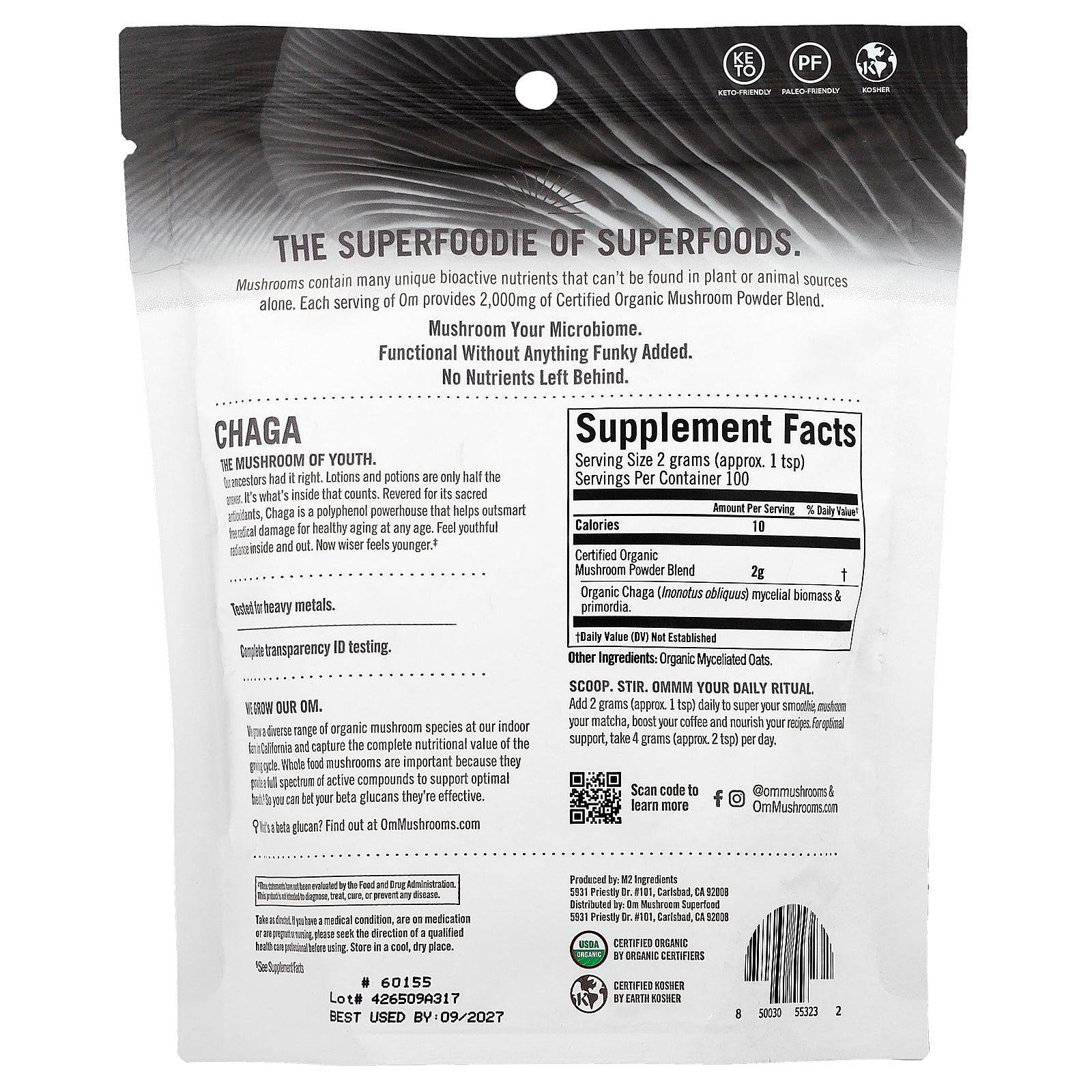 Mushrooms contain many unique bioactive nutrients that can't be found in plant or animal sources alone. Each serving of Om provides 2,000 mg of Certified Organic Mushroom Powder Blend.