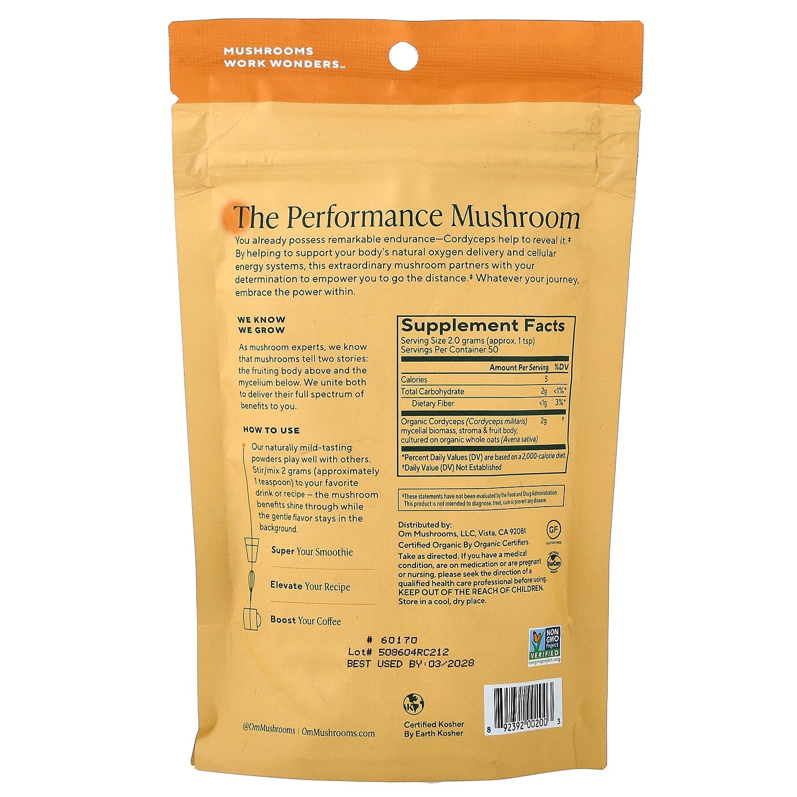 | Organic Cordyceps (Cordyceps militaris) Mycelial Biomass, Stroma & Fruit Body; cultured on Organic Whole Oats (Avena sativa) |