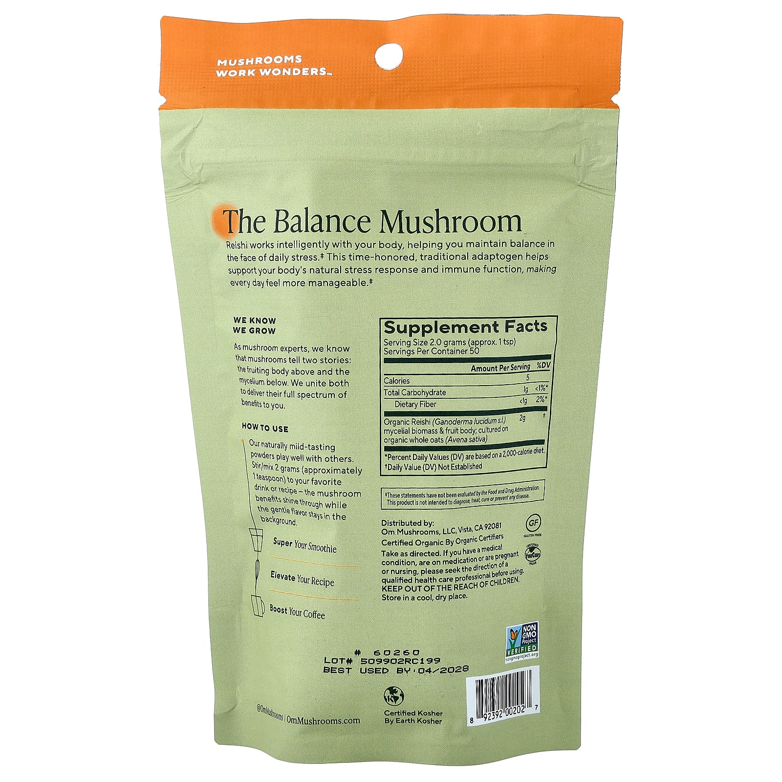 | Organic Reishi (Ganoderma lucidum s.l.) Mycelia Biomass and Fruit Body; Cultured on Organic Whole Oats (Avena sativa) | 2 g |