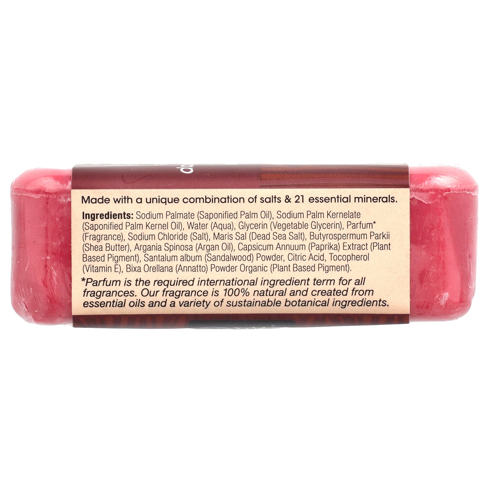 Sodium palmate (saponified palm oil), sodium palm kernelate (saponified palm kernel oil), water (aqua), glycerin (vegetable glycerin), parfum* (fragrance), sodium chloride (salt), maris sal (dead sea salt), butyrospermum parkii (shea butter), argania spinosa (argan oil), capsicum annuum (paprika) extract (plant based pigment), santalum album (sandalwood) powder, citric acid, tocopherol (vitamin e), bixa orellana (annatto) powder organic (plant based pigment).