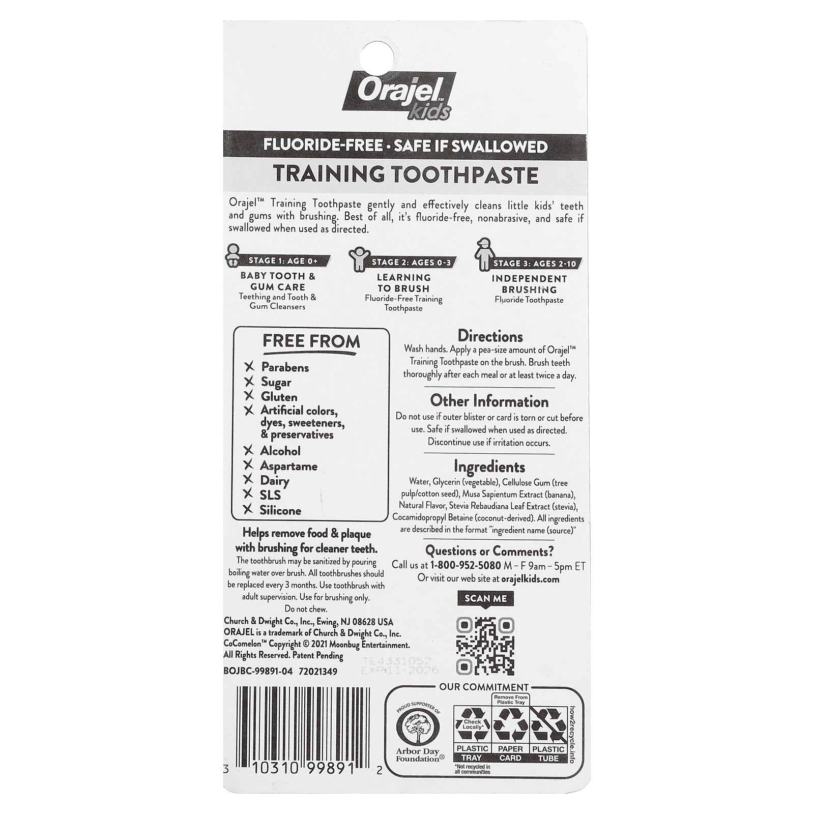 Orajel™ Training Toothpaste gently and effectively cleans little kids' teeth and gums with brushing. Best of all, it's fluoride-free, nonabrasive, and safe if swallowed when used as directed.
