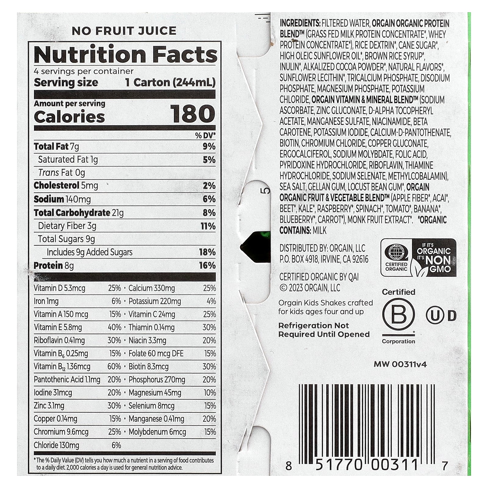 Refrigeration not required until opened. Organic kids shake crafted for kids ages four and up.