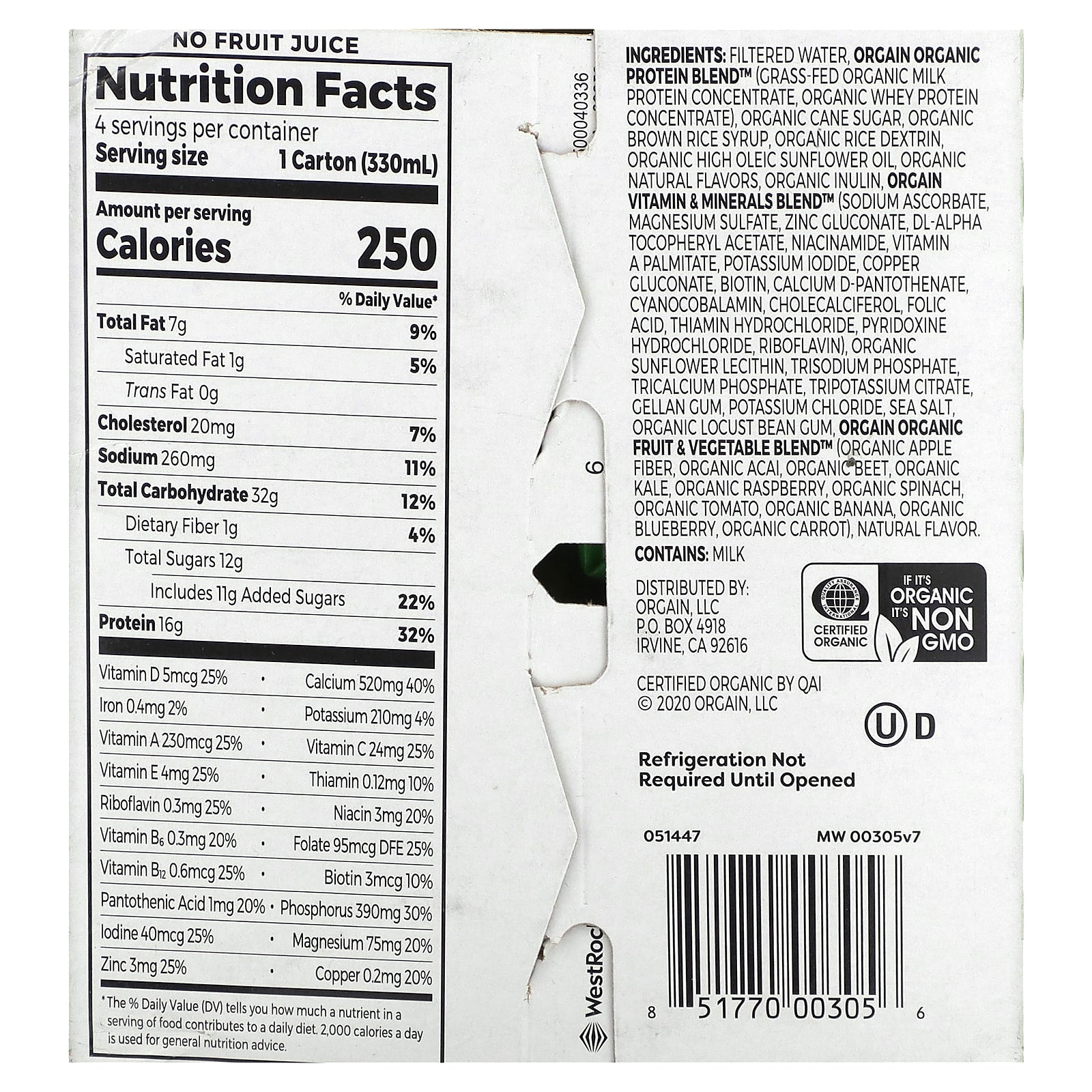 Filtered water, orgain organic protein blend™ (grass-fed organic milk protein concentrate, organic whey protein concentrate), organic cane sugar, organic brown rice syrup, organic rice dextrin, organic high oleic sunflower oil, organic natural flavors, organic inulin, orgain vitamin & minerals blend™ (sodium ascorbate, magnesium sulfate, zinc gluconate, dl-alpha tocopheryl acetate, niacinamide, vitamin A palmitate, potassium iodide, copper gluconate, biotin, calcium d-pantothenate, cyanocobalamin, cholecalciferol, folic acid, thiamin hydrochloride, pyridoxine hydrochloride, riboflavin), organic sunflower lecithin, trisodium phosphate, tricalcium phosphate, tripotassium citrate, gellan gum, potassium chloride, sea salt, organic locust bean cum, orgain organic fruit & vegetable blend™ (organic apple fiber, organic acai organic beet, organic kale, organic raspberry, organic spinach, organic tomato, organic banana, organic blueberry, organic carrot), natural flavor.