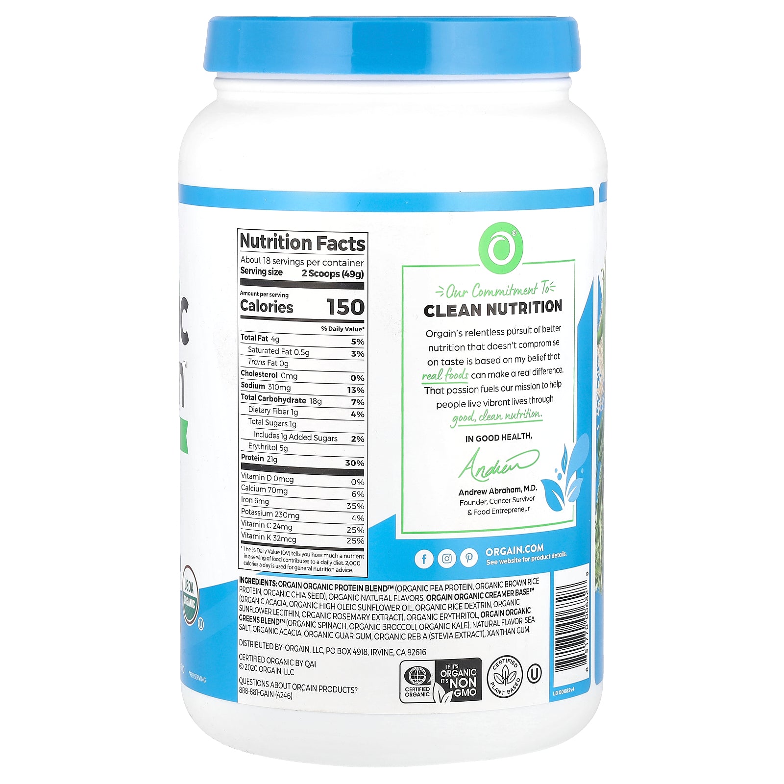 Orgain Organic Protein Blend™ (organic pea protein, organic brownale protein, organic chia seed), organic natural flavors, Orgain Organic Creamer Base™ (organic acacia, organic high oleic sunflower oil, organic rice dextrin, organic sunflower lecithin, organic rosemary extract), organic erythritol orgain Organic Greens Blend™ (organic spinach, organic broccoli, organic kale), natural flavor, sza salt. organic acacia, organic guar gum, organic reb a (stevia extract), xanthan gum.