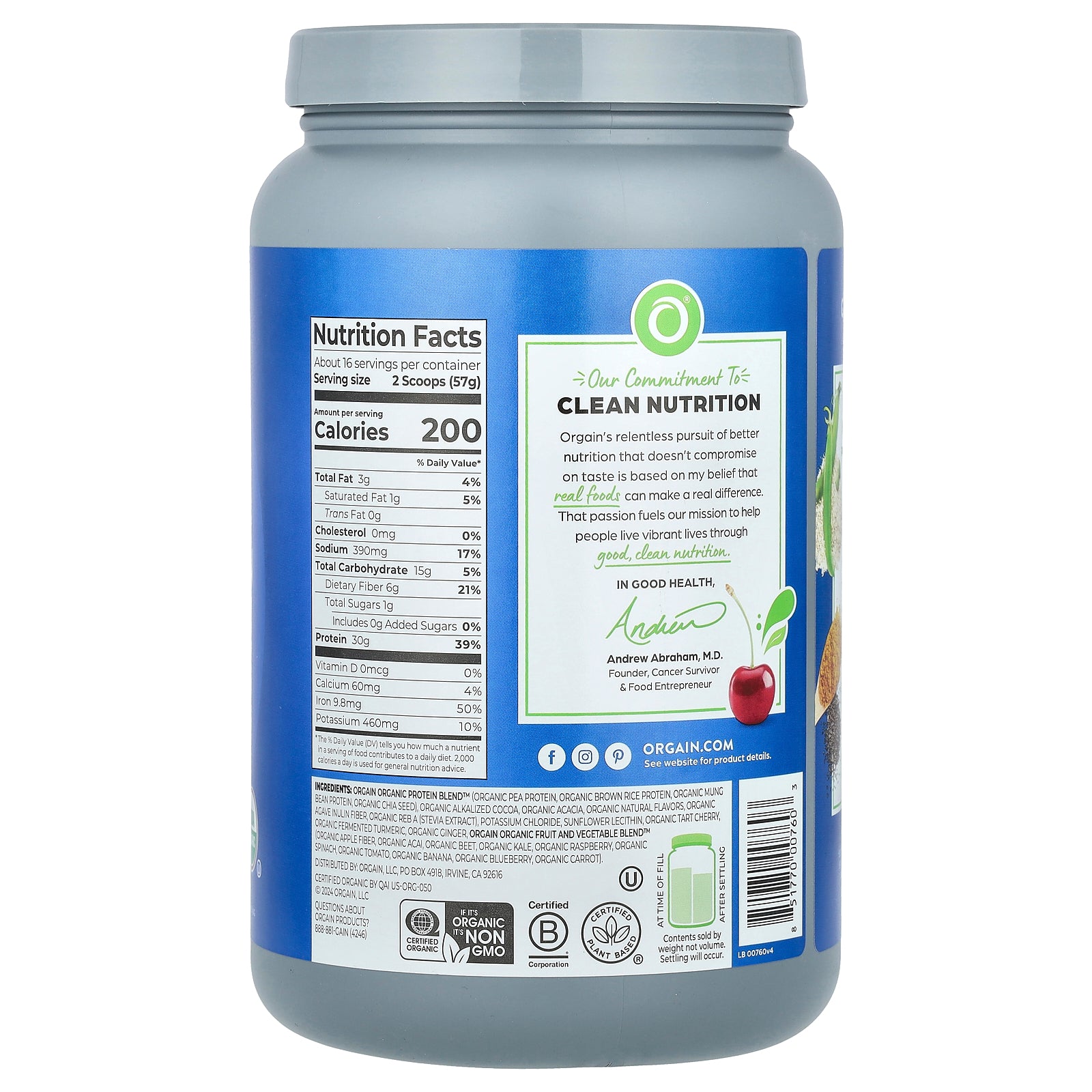 Orgain organic protein blend™ (organic pea protein, organic brown rice protein, organic mung bean protein, organic chia seed), organic alkalized cocoa, organic acacia, organic natural flavors, organic agave inulin fiber, organic reb a (stevia extract), potassium chloride, sunflower lecithin, organic tart cherry, organic fermented turmeric, organic ginger, orgain organic fruit and vegetable blend™ (organic apple fiber, organic acai, organic beet, organic kale organic raspberry, organic spinach, organic tomato, organic banana, organic blueberry, organic carrot).