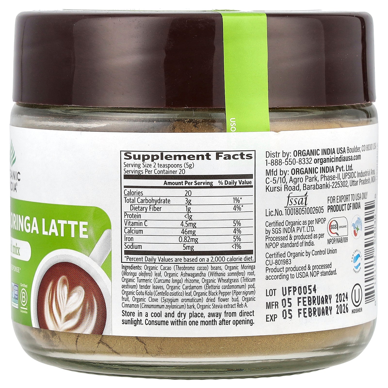 Organic cacao (theobroma cacao) beans, organic moringa (moringa oleifera) leaf, organic ashwagandha (withania somnifera) root, organic turmeric (curcuma longa) rhizome, organic wheatgrass (triticum aestivum) tender leaves, organic cardamom (elettaria cardamomum) pod, organic gotu kola (centella asiatica) leaf, organic black pepper (piper nigrum) fruit, organic clove (syzygium aromaticum) dried flower bud, organic cinnamon (cinnamomum zeylanicum) bark, organic stevia extract reb a.
