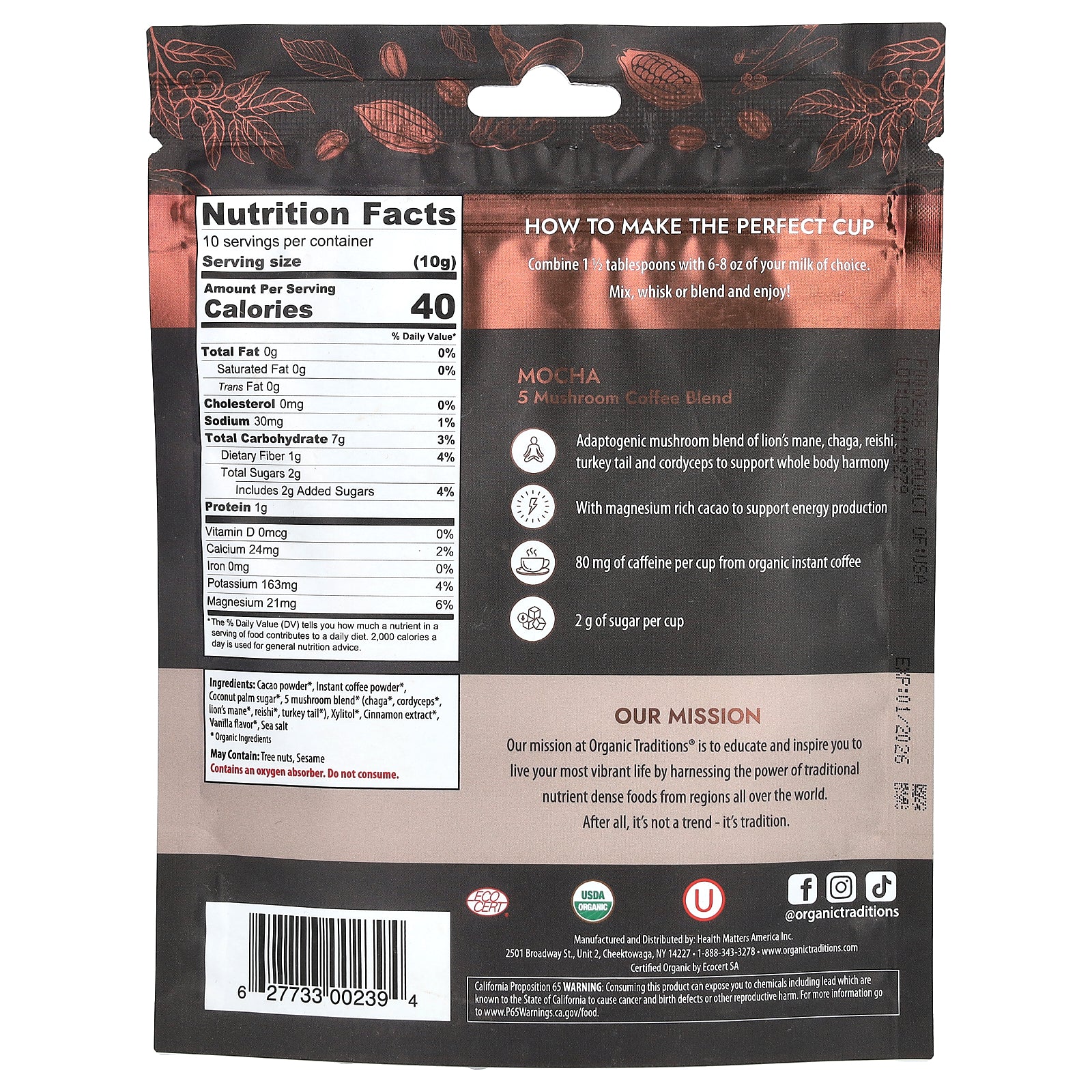 Cacao powder*, instant coffee powder*, coconut palm sugar*, 5 mushroom blend* (chaga*, cordyceps*, lion's mane*, reishi*, turkey tail*), xylitol*, cinnamon extract*, vanilla flavor*, sea salt.
