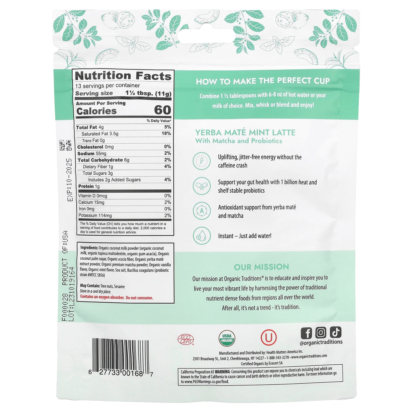 Organic coconut milk powder (organic coconut milk, organic tapioca maltodextrin, organic gum acacia), organic coconut palm sugar, organic acacia fiber, organic yerba maté extract powder, organic premium matcha powder, organic vanilla flavor, organic mint flavor, sea salt, bacillus coagulans (probiotic strain #mtcc 5856).