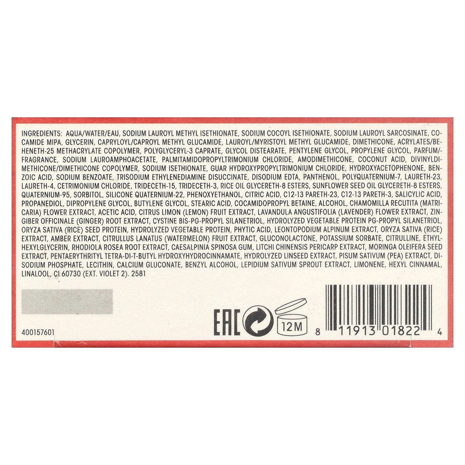 Aqua/water, sodium lauroyl methyl isethionate, sodium cocoyl isethionate, sodium lauroyl sarcosinate, cocamide mipa, glycerin, capryloyl/caproyl methyl glucamide, lauroyl/myristoyl methyl glucamide, dimethicone, acrylates/be- heneth-25 methacrylate copolymer, polyglyceryl-3 caprate, glycol distearate, pentylene glycol, propylene glycol, parfum/- fragrance, sodium lauroamphoacetate, palmitamidopropyltrimonium chloride, amodimethicone, coconut acid, divinyldimethicone/dimethicone copolymer, sodium isethionate, guar hydroxypropyltrimonium chloride, hydroxyacetophenone, ben- zoic acid, sodium benzoate, trisodium ethylenediamine disuccinate, disodium edta, panthenol, polyquaternium-7, laureth-23, laureth-4, cetrimonium chloride, trideceth-15, trideceth-3, rice oil glycereth-8 esters, sunflower seed oil glycereth-8 esters, quaternium-95, sorbitol, silicone quaternium-22, phenoxyethanol, citric acid, c12-13 pareth-23, c12-13 pareth-3, salicylic acid, propanediol, dipropylene glycol, butylene glycol, stearic acid, cocamidopropyl betaine, alcohol, chamomilla recutita (matricaria) flower extract, acetic acid, citrus limon (lemon) fruit extract, lavandula angustifolia (lavender) flower extract, zingiber officinale (ginger) root extract, cystine bis-pg-propyl silanetriol, hydrolyzed vegetable protein pg-propyl silanetriol, oryza sativa (rice) seed protein, hydrolyzed vegetable protein, phytic acid, leontopodium alpinum extract, oryza sativa (rice) extract, amber extract, citrullus lanatus (watermelon) fruit extract, gluconolactone, potassium sorbate, citrulline, ethylhexylglycerin, rhodiola rosea root extract, caesalpinia spinosa gum, litchi chinensis pericarp extract, moringa oleifera seed extract, pentaerythrityl tetra-di-t-butyl hydroxyhydrocinnamate, hydrolyzed linseed extract, pisum sativum (pea) extract, disodium phosphate, lecithin, calcium gluconate, benzyl alcohol, lepidium sativum sprout extract, limonene, hexyl cinnamal, linalool, cl 60730 (ext. violet 2).