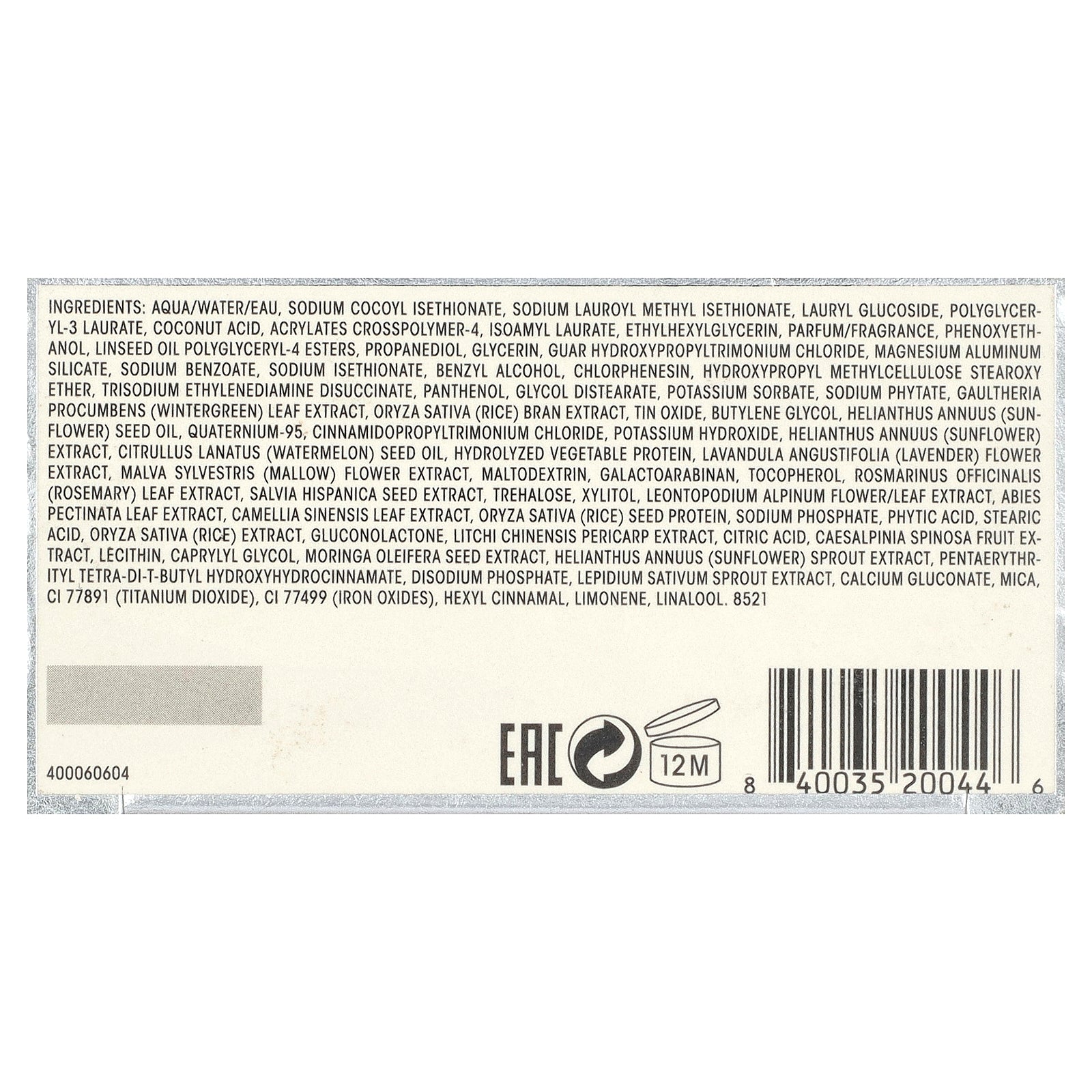 Water, sodium cocoyl isethionate, sodium lauroyl methyl isethionate, lauryl glucoside, polyglyceryl-3 laurate, coconut acid, acrylates crosspolymer-4, isoamyl laurate, ethylhexylglycerin, parfum/fragrance, phenoxyethanol, linseed oil polyglyceryl-4 esters, propanediol, glycerin, guar hydroxypropyltrimonium chloride, magnesium aluminum silicate, sodium benzoate, sodium isethionate, benzyl alcohol, chlorphenesin, hydroxypropyl methylcellulose stearoxy ether, trisodium ethylenediamine disuccinate, panthenol, glycol distearate, potassium sorbate, sodium phytate, gaultheria procumbens (wintergreen) leaf extract, oryza sativa (rice) bran extract, tin oxide, butylene glycol, helianthus annuus (sunflower) seed oil, quaternium-95, cinnamidopropyltrimonium chloride, potassium hydroxide, helianthus annuus (sunflower) extract, citrullus lanatus (watermelon) seed oil, hydrolyzed vegetable protein, lavandula angustifolia (lavender) flower extract, malva sylvestris (mallow) flower extract, maltodextrin, galactoarabinan, tocopherol, rosmarinus officinalis (rosemary) leaf extract, salvia hispanica seed extract, trehalose, xylitol, leontopodium alpinum flower/leaf extract, abies pectinata leaf extract, camellia sinensis leaf extract, oryza sativa (rice) seed protein, sodium phosphate, phytic acid, stearic acid, oryza sativa (rice) extract, gluconolactone, litchi chinensis pericarp extract, citric acid, caesalpinia spinosa fruit extract, lecithin, caprylyl glycol, moringa oleifera seed extract, helianthus annuus (sunflower) sprout extract, pentaerythrityl tetra-di-t-butyl hydroxyhydrocinnamate, disodium phosphate, lepidium sativum sprout extract, calcium gluconate, mica, ci 77891 (titanium dioxide), ci 77499 (iron oxides), hexyl cinnamal, limonene, linalool.