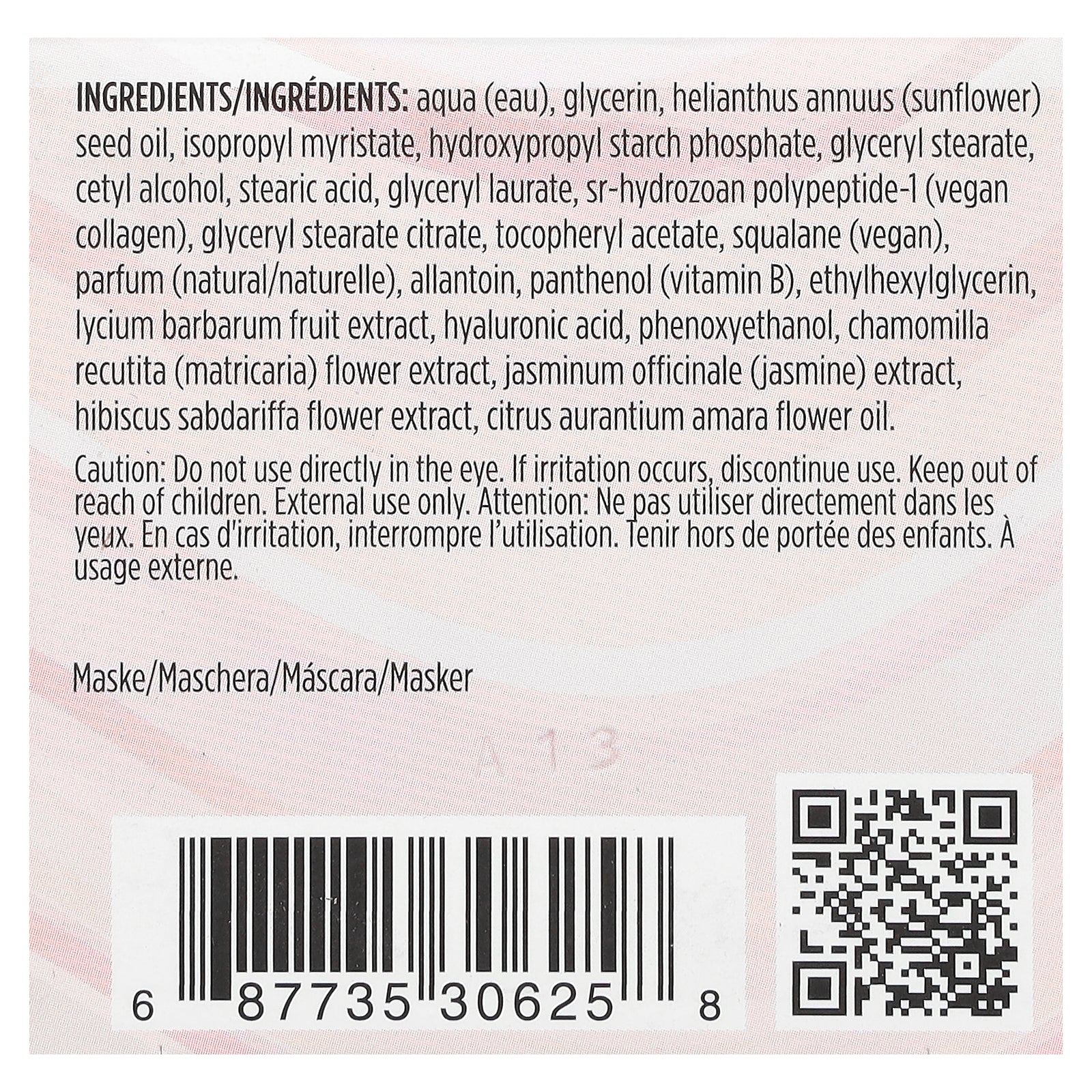 Water, glycerin, helianthus annuus (sunflower) seed oil, isopropyl myristate, hydroxypropyl starch phosphate, glyceryl stearate, cetyl alcohol, stearic acid, glyceryl laurate, sr-hydrozoan polypeptide-1 (vegan collagen), glyceryl stearate citrate, tocopheryl acetate, squalane (vegan), parfum (natural), allantoin, panthenol (vitamin B), ethylhexylglycerin, lycium barbarum fruit extract, hyaluronic acid, phenoxyethanol, chamomilla recutita (matricaria) flower extract, jasminum officinale (jasmine) extract, hibiscus sabdariffa flower extract, citrus aurantium amara flower oil.