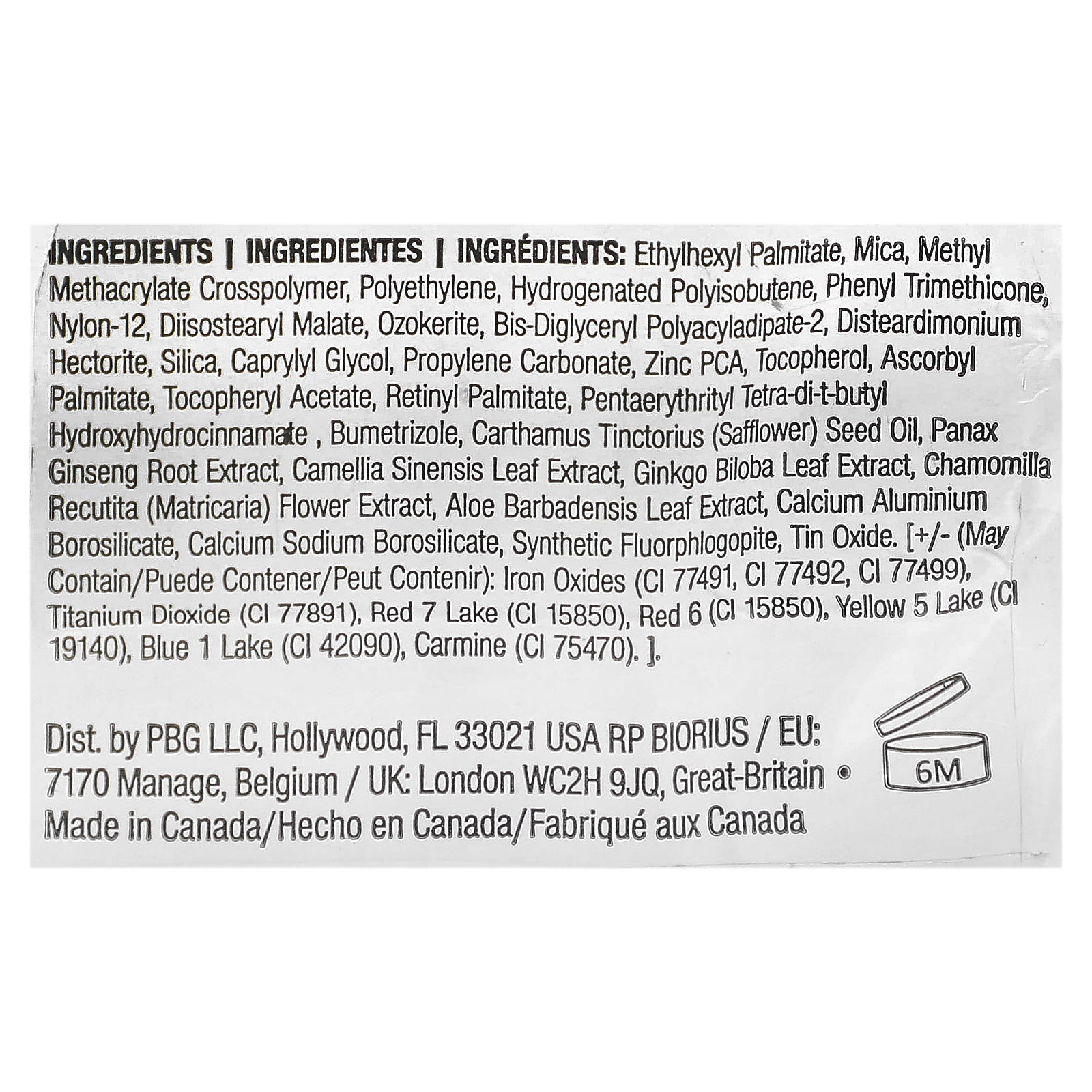 Ethylhexyl palmitate, mica, methyl methacrylate crosspolymer, polyethylene, hydrogenated polyisobutene, phenyl trimethicone nylon-12, diisostearyl malate, ozokerite, bis-diglyceryl polyacyladipate-2, disteardimonium hectorite, silica, caprylyl glycol, propylene carbonate, zinc pca, tocopherol, ascorbyl palmitate, tocopheryl acetate, retinyl palmitate, pentaerythrityl tetra-di-t-butyl hydroxyhydrocinnamate , bumetrizole, carthamus tinctorius (safflower) seed oil, panax ginseng root extract, camellia sinensis leaf extract, ginkgo biloba leaf extract, chamomilla recutita (matricaria) flower extract, aloe barbadensis leaf extract, calcium aluminum borosilicate, calcium sodium borosilicate, synthetic fluorphlogopite, tin oxide. [+/- (may contain): iron oxides (ci 77491, ci 77492, ci 77499), titanium dioxide (ci 77891), red 7 lake (ci 15850), red 6 (ci 15850), yellow 5 lake (ci 19140), blue 1 lake (ci 42090), carmine (ci 75470). ].
