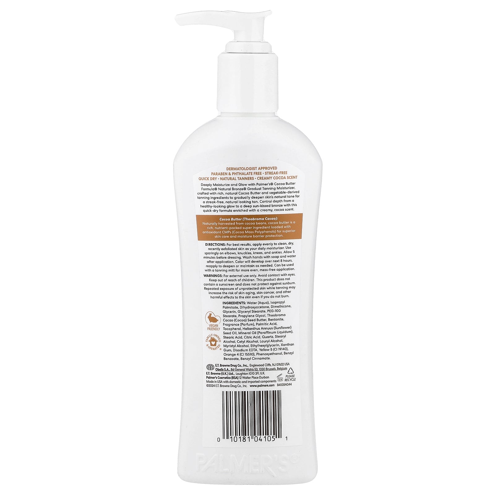 Deeply Moisturize and Glow with Palmer's® Cocoa Butter Formula® Natural Bronze® Gradual Tanning Moisturizer, crafted with rich, natural Cocoa Butter and vegetable-derived tanning ingredients to gradually deepen skin's natural tone for a streak-free, natural looking tan. Control depth from a healthy-looking glow to a deep sun-kissed bronze with this quick-dry formula enriched with a creamy, cocoa scent.