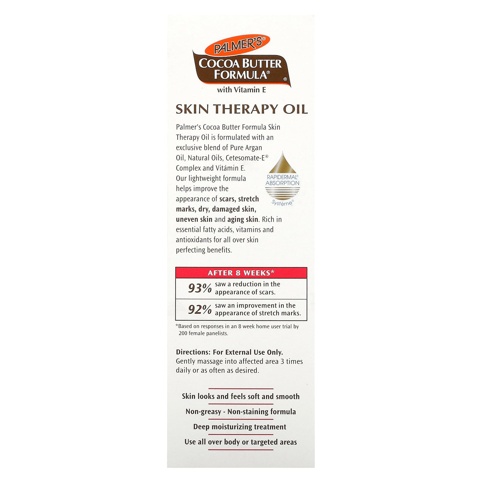 Palmer's Cocoa Butter Formula Skin Therapy Oil is formulated with an exclusive blend of Pure Argan Oil, Natural Oils, Cetesomate-E Complex and Vitamin E. Our lightweight formula helps improve the appearance of scars, stretch marks, dry, damaged skin, uneven skin and aging skin. Rich in essential acids, vitamins and antioxidants for all over skin perfecting benefits.