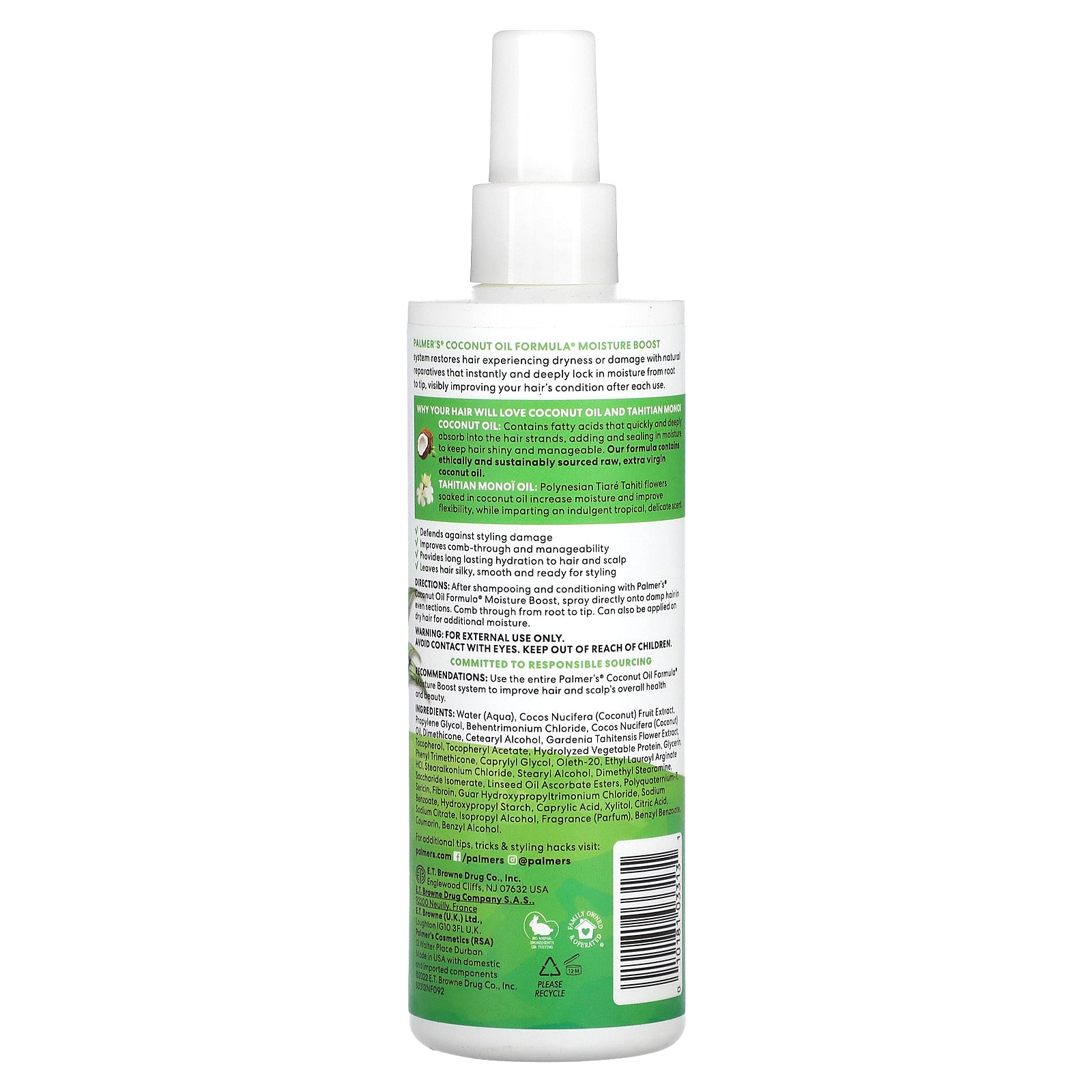 After shampooing and conditioning with Palmer's® Coconut Oil Formula® Moisture Boost, spray directly onto damp hair in even sections. Comb through from root to tip. Can also be applied on dry hair for additional moisture.
