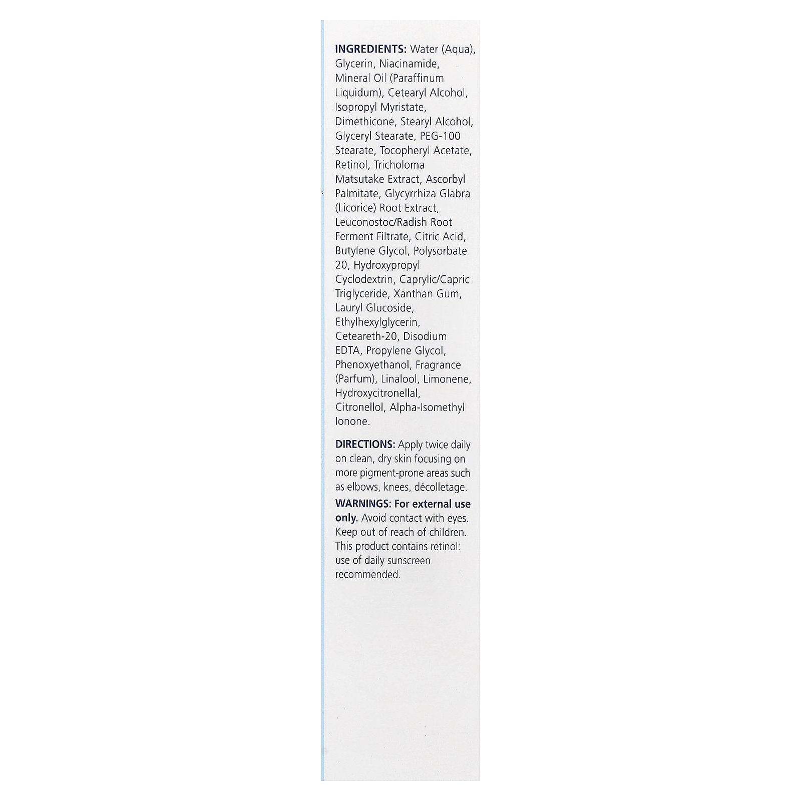 Water (aqua), glycerin, niacinamide, mineral oil (paraffinum liquidum), cetearyl alcohol, isopropyl myristate, dimethicone, stearyl alcohol, glyceryl stearate, peg-100 stearate, tocopheryl acetate, retinol, tricholoma matsutake extract, ascorbyl palmitate, glycyrrhiza glabra (licorice) root extract, leuconostoc/radish root ferment filtrate, citric acid, butylene glycol, polysorbate 20, hydroxypropyl cyclodextrin, caprylic/capric triglyceride, xanthan gum, lauryl glucoside, ethylhexylglycerin, ceteareth-20, disodium edta, propylene glycol, phenoxyethanol, fragrance (parfum), linalool, limonene, hydroxycitronellal, citronellol, alpha-isomethyl lonone.