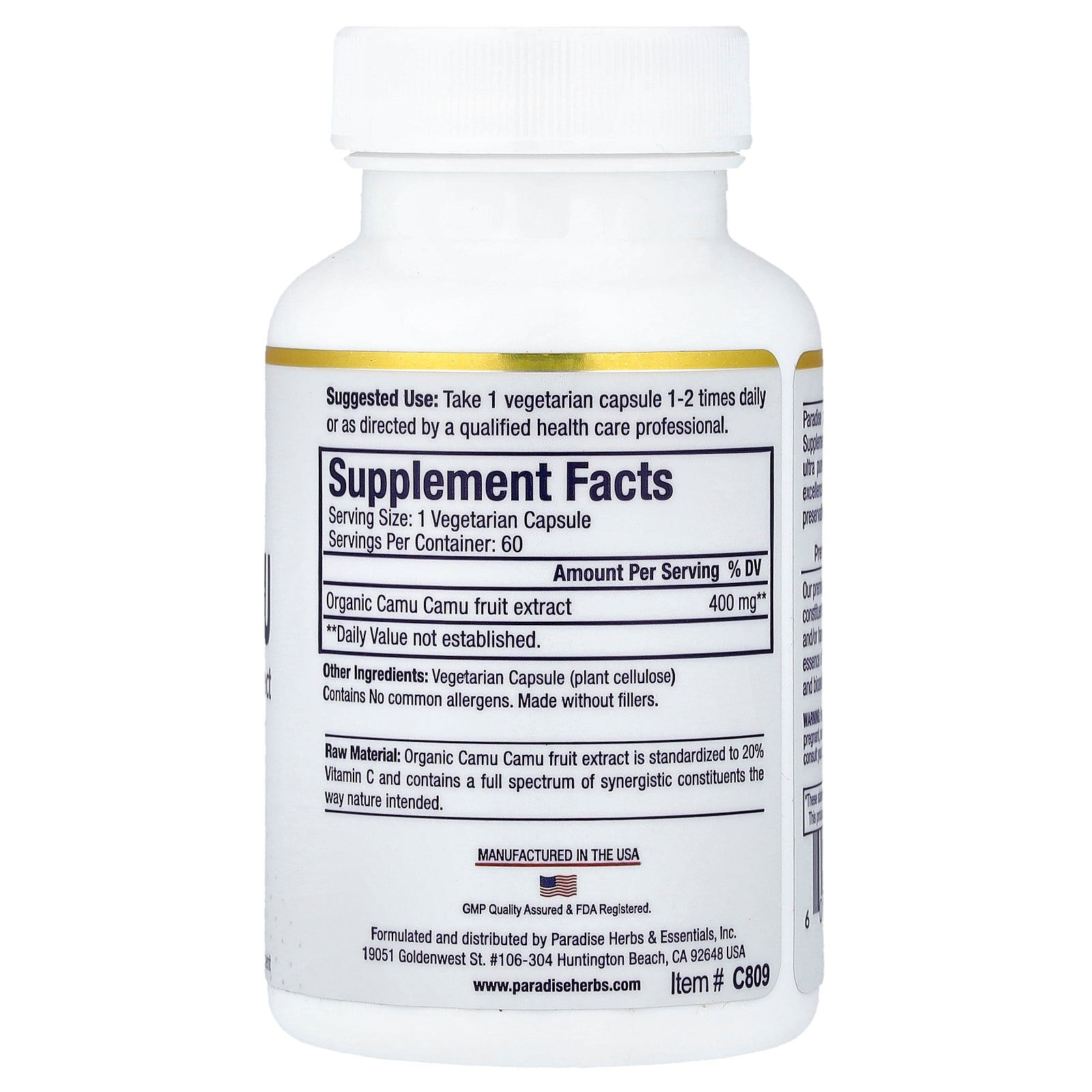 Raw Material: Organic camu camu fruit extract is standardized to 20% vitamin C and contains a full spectrum of synergistic constituents the way nature intended.
