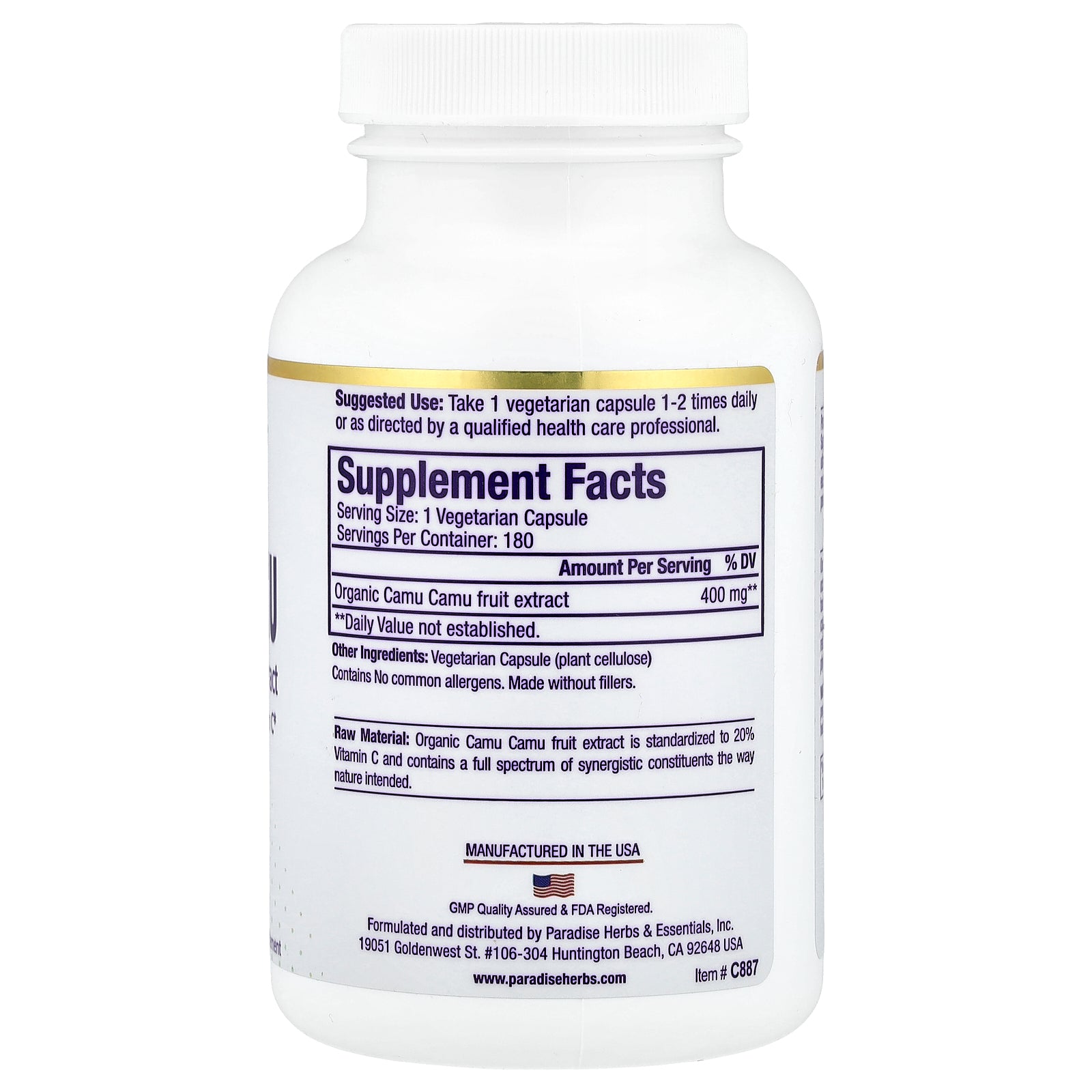 Raw Material: Organic Camu Camu fruit extract is standardized to 20% Vitamin C and contains a full spectrum of synergistic constituents the way nature intended.