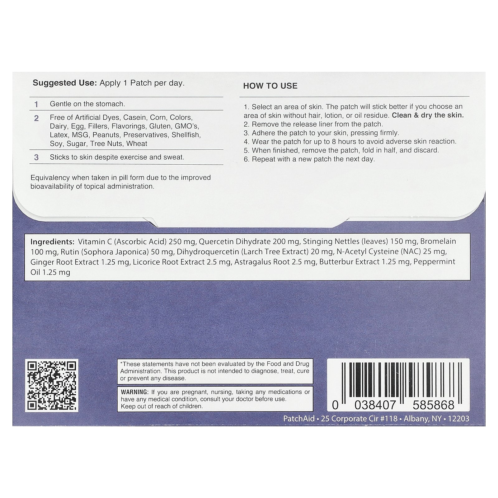 Vitamin c (ascorbic acid) 250 mg, quercetin dihydrate 200 mg, stinging nettles (leaves) 150 mg, bromelain 100 mg, rutin (sophora japonica) 50 mg, dihydroquercetin (larch tree extract) 20 mg, n-acetyl cysteine (nac) 25 mg, ginger root extract 1.25 mg, licorice root extract 2.5 mg, astragalus root 2.5 mg, butterbur extract 1.25 mg, peppermint oil 1.25 mg.